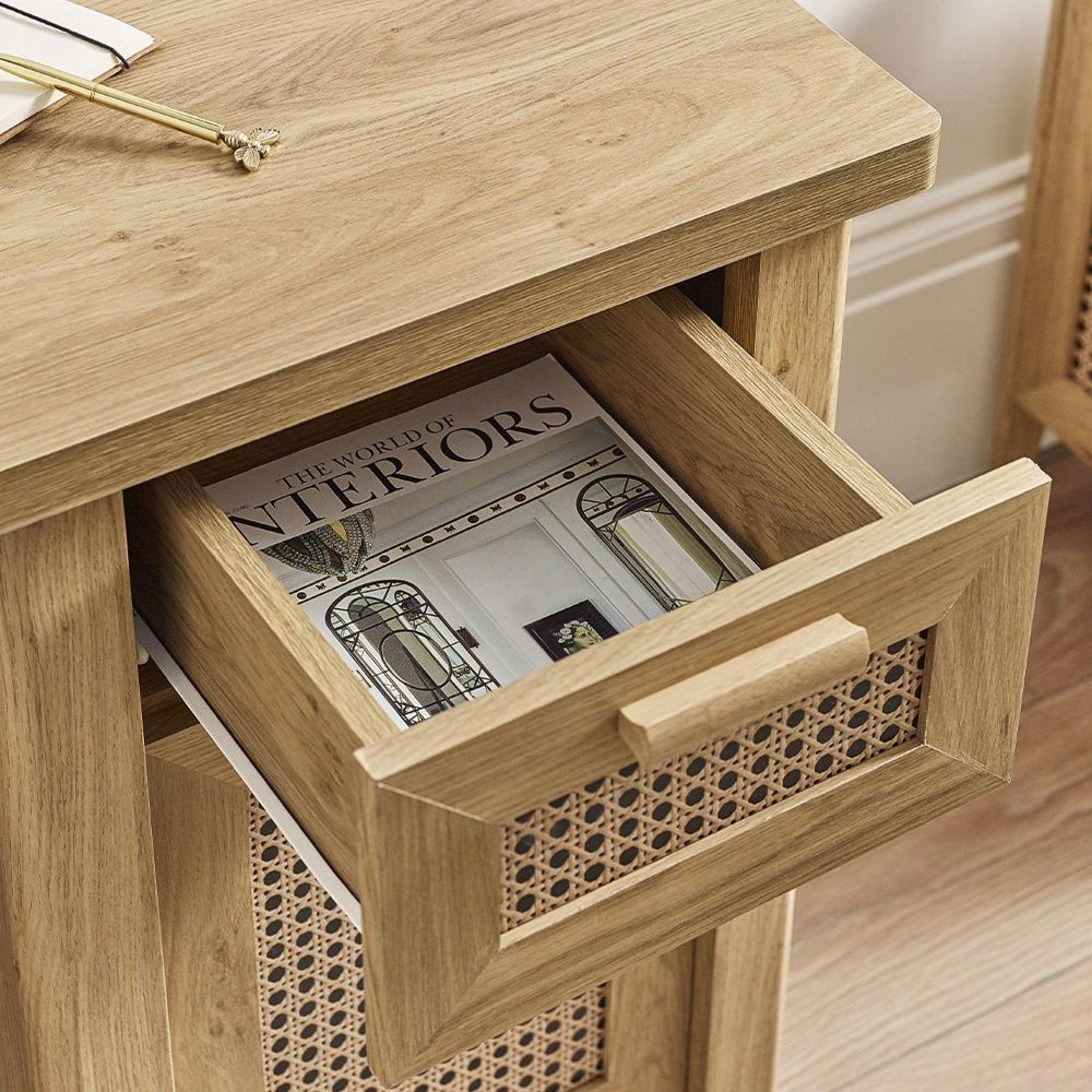 Item Code: SYD011 Showcasing a beautifully sleek design with a bohemian feel, the Sydney Desk offers exquisitely curved edging with gentle soft lines stunningly combined with a rattan effect front. Finished with a natural oak effect featuring one pull-out drawer and one cupboard providing the ideal storage space for stationary essentials. All around creating the perfect airy, warm feel within your home.