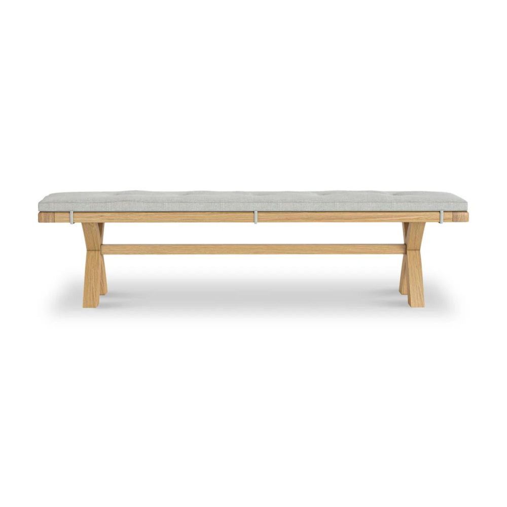 Designed for comfort, the bench includes a generously padded beige fabric seat, perfect for family meals or casual entertaining. Its robust construction accommodates up to three adults, providing a durable and practical seating solution while maintaining farmhouse elegance. The bench pairs seamlessly with the Normandy Oak 8–10 Seater Cross-Leg Extending Dining Table, creating a cohesive and inviting dining setup.
