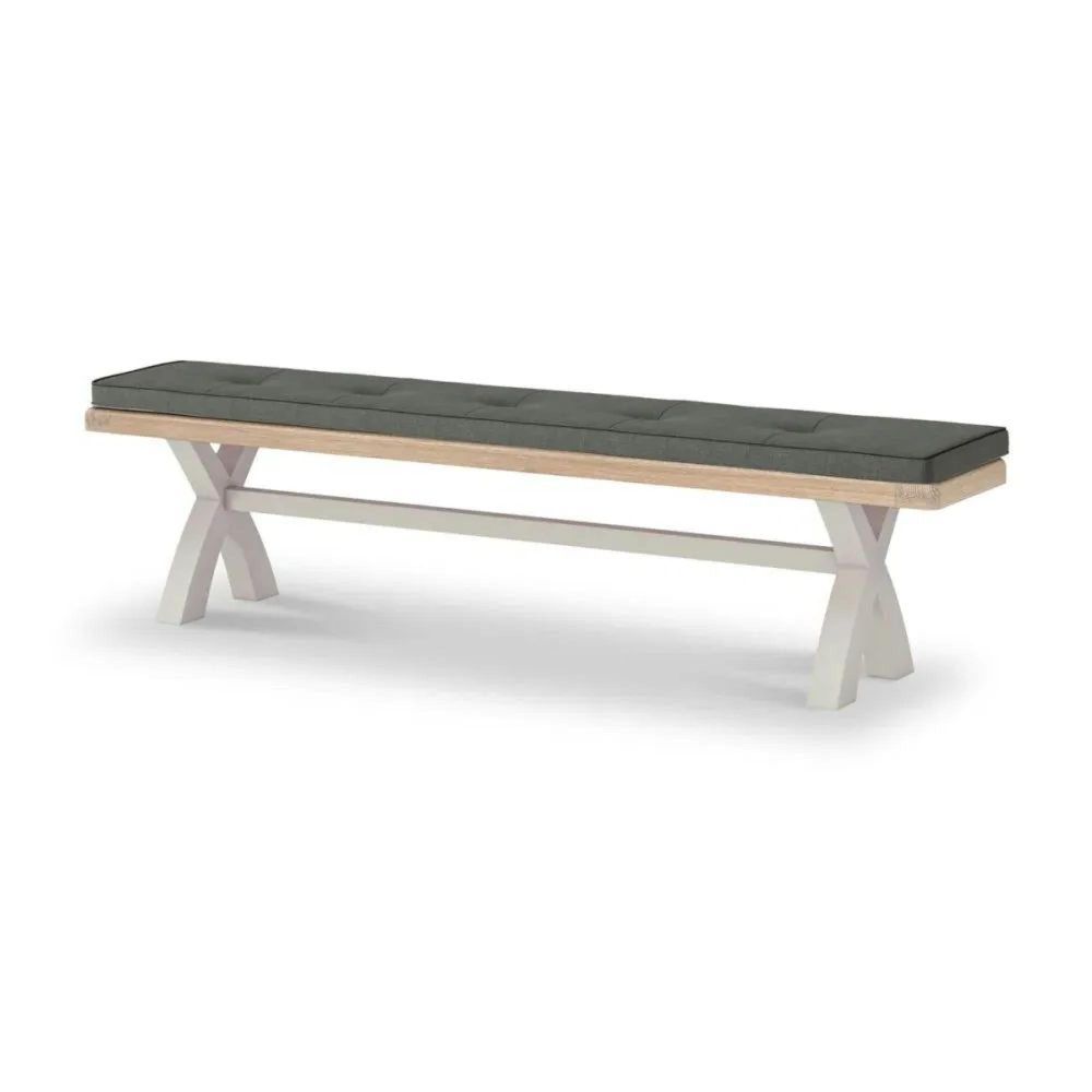 Available in sage green and stone grey painted finishes, this bench pairs beautifully with the Normandy Oak 8-10 Seater Cross-Leg Extending Dining Table, creating a coordinated and elegant dining set.
