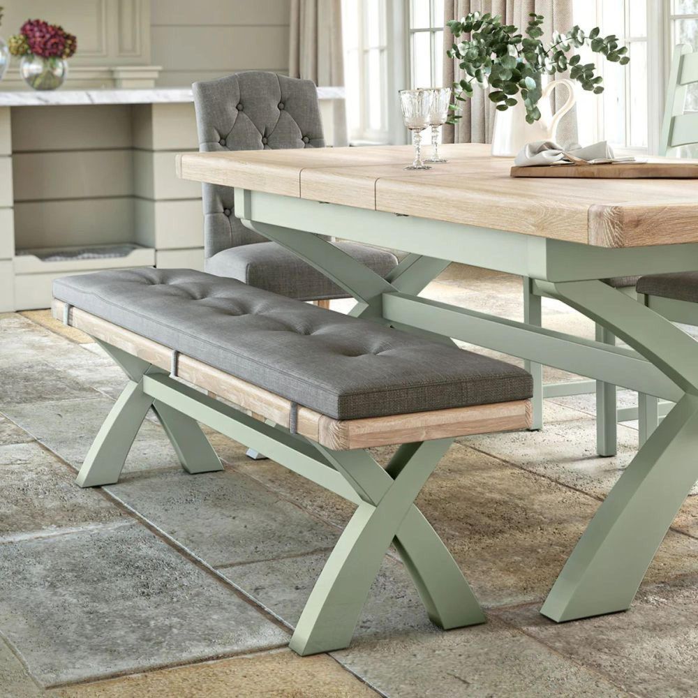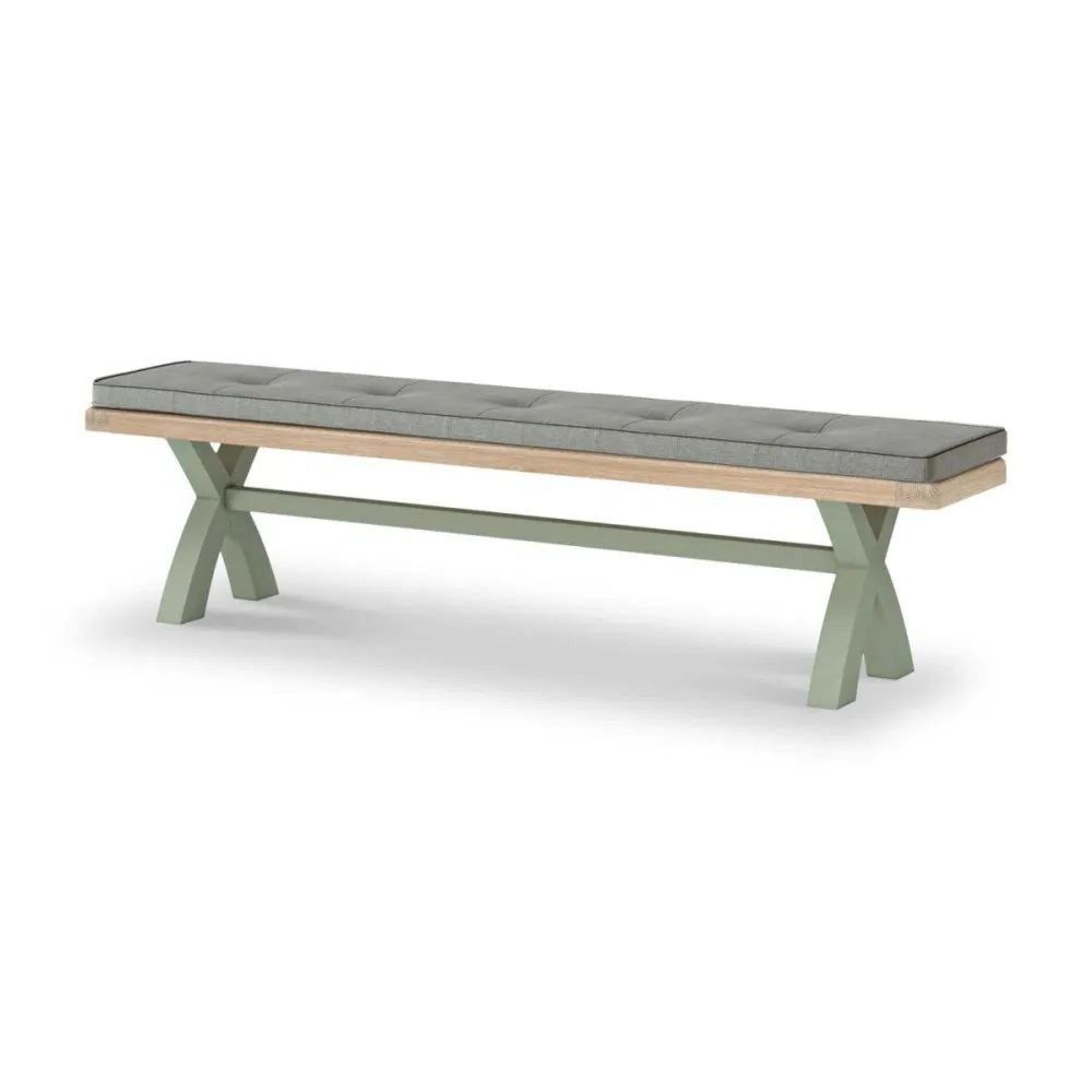 The natural oak-finished top pairs beautifully with the painted sage green or stone grey frame, offering a soft, classic contrast that complements a variety of dining tables and room decors. The thick, fabric seat—available in grey, charcoal, or beige—provides exceptional comfort for up to three adults, making this bench both functional and inviting. Perfectly designed to pair with the Normandy Oak 8-10 Seater Cross-Leg Extending Dining Table, it completes a cohesive and stylish dining setup.