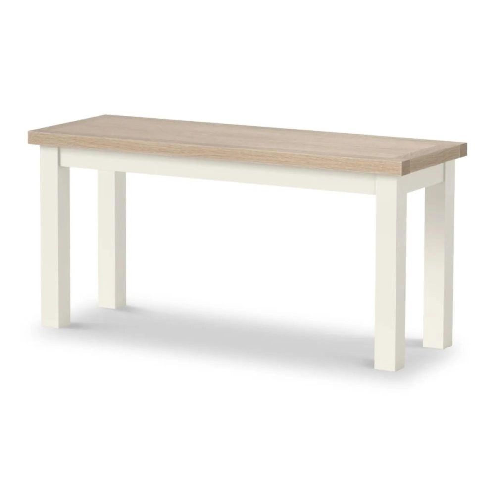 Crafted from solid wood and oak, the bench features a durable painted frame available in coconut white or light grey, or a full white-washed oak finish. Its sturdy block legs ensure long-lasting stability, while the simple, elegant design allows it to fit seamlessly alongside any dining table.