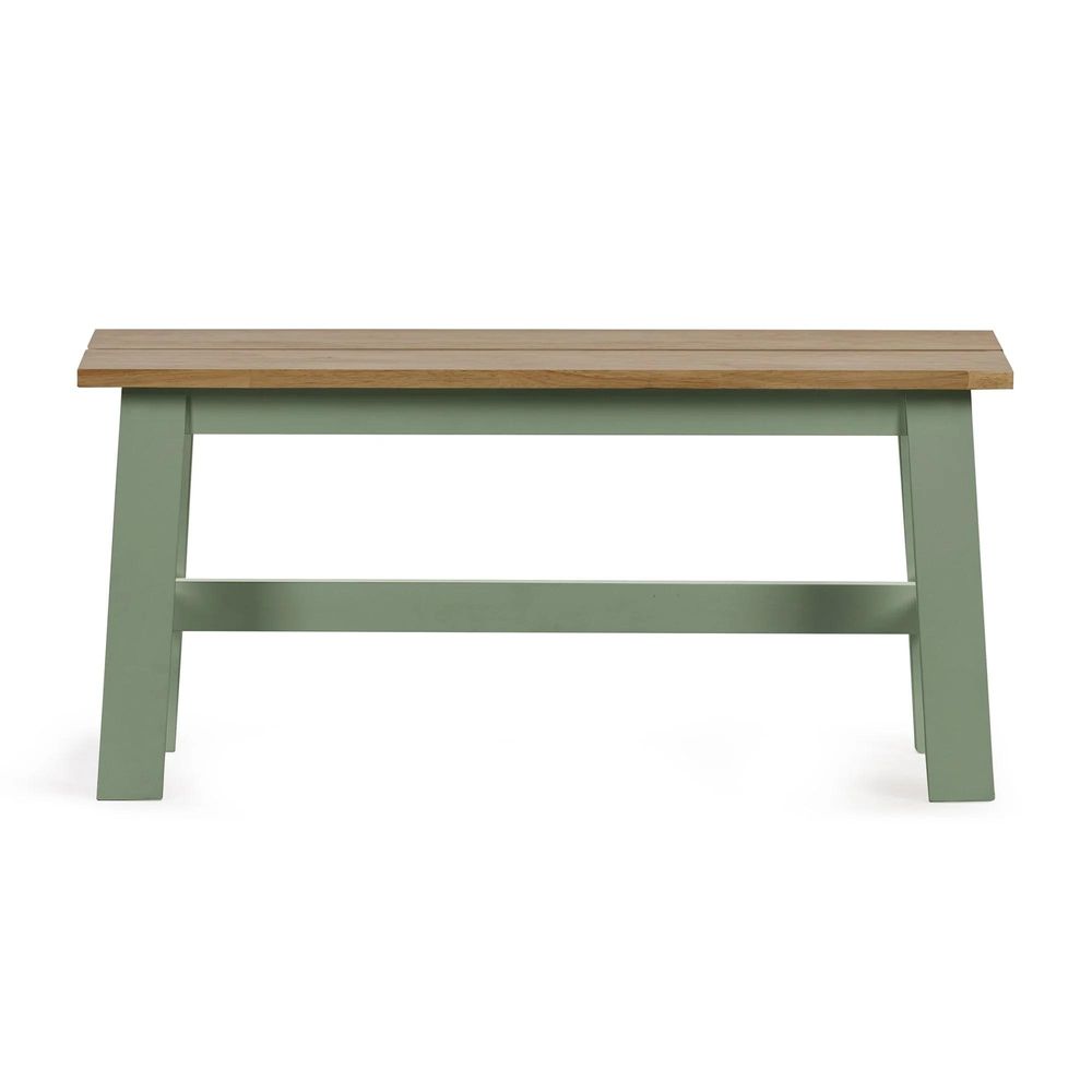Item Code: LIN103 Add a touch of relaxed style to your home with this charming dining bench, perfect for casual meals or cosy family gatherings. Featuring a warm natural oak-effect seat and a soft sage green frame, the bench brings a timeless, rustic feel to any space. Its slim, space-saving design allows it to tuck neatly under the table, helping to keep your dining area open and clutter-free. Whether used as everyday seating or an extra spot for guests, this versatile bench is a stylish and practical addition to any room. Table and chairs sold separately. Partial assembly Required.