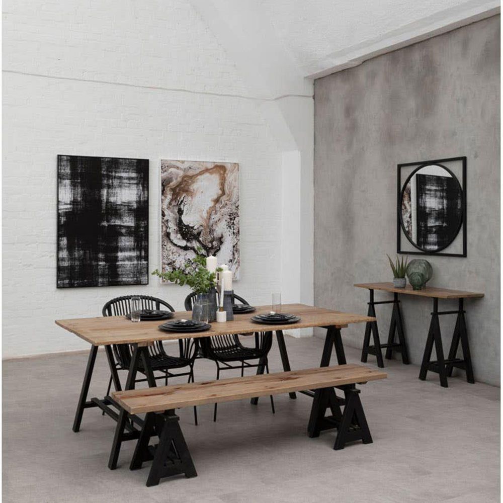 Item Code: 5501149 Lightly-coloured and beautifully grained, the surface of the Hampstead bench is made from weathered antique pine.A pair of distinctive trestles at each end supports the thick and robust seating area. Formed from sturdy iron and finished in black, they enhance the industrial credentials of this striking bench. Pair it with the Hampstead dining table.