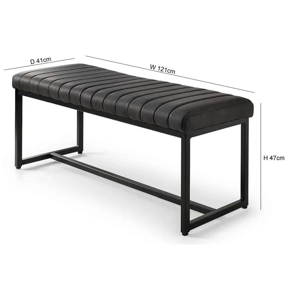 Item Code: SOH002 The Soho Bench adds an industrial, retro theme to any dining area. Finished in an antique black faux leather with a striking gunmetal frame, sure to compliment any contemporary decor. The perfect match for the Brooklyn Dining Table.