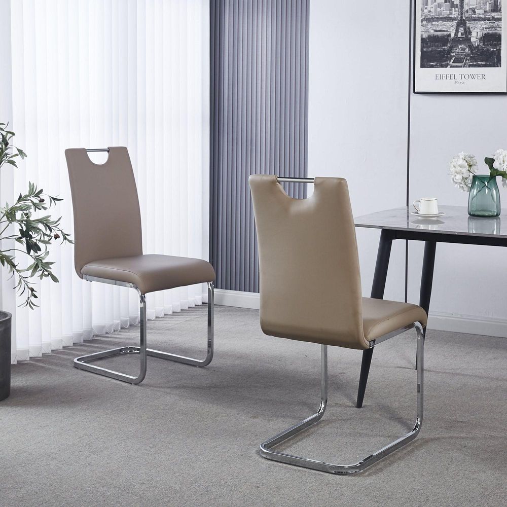 The softly padded single-piece seat is upholstered in smooth beige faux leather, offering a luxurious feel with the practicality of an easy-to-clean surface. The high back design, paired with a slight curve, provides ergonomic support for long, relaxed meals. A discreet chrome handle at the top of the backrest makes moving the chair effortless, while the sturdy chrome cantilever base ensures stability and contemporary appeal.
