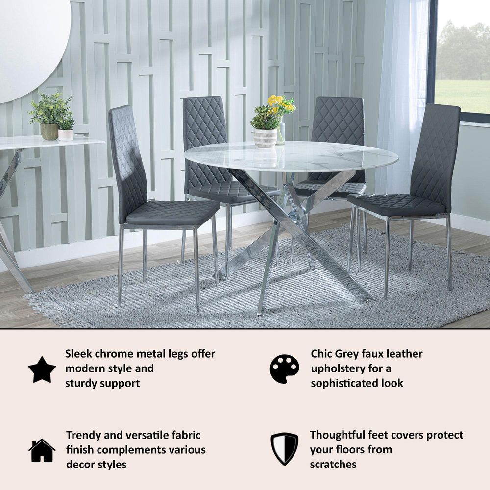 The Metro Dining Chair in Grey combines refined design with everyday practicality. Upholstered in soft grey faux leather and finished with a sleek chrome metal leg, this piece brings together comfort, craftsmanship, and timeless style. A slim, high backrest with ergonomic contouring offers supportive seating for long dinners and relaxed conversations. The diamond quilted stitching on both the seat and back adds a subtle touch of texture, underscoring the chair's luxurious feel.