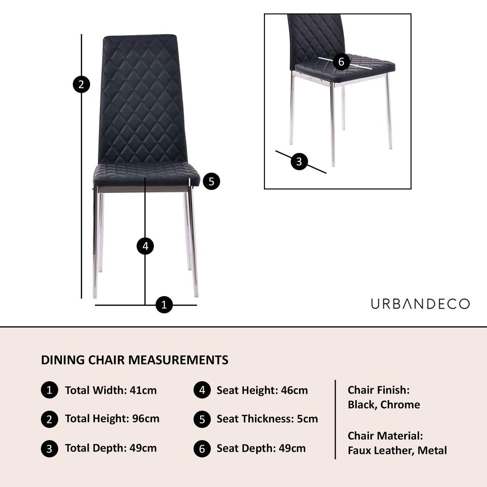 Refined in form and built with care, the Metro Dining Chair in Black offers a perfect balance of elegance, comfort, and functionality. Upholstered in soft, high quality faux leather, this chair brings a touch of modern sophistication to any dining setting. The diamond quilted stitching across the seat and backrest reflects thoughtful detailing, while the slim, ergonomic design provides gentle support without compromising on style.