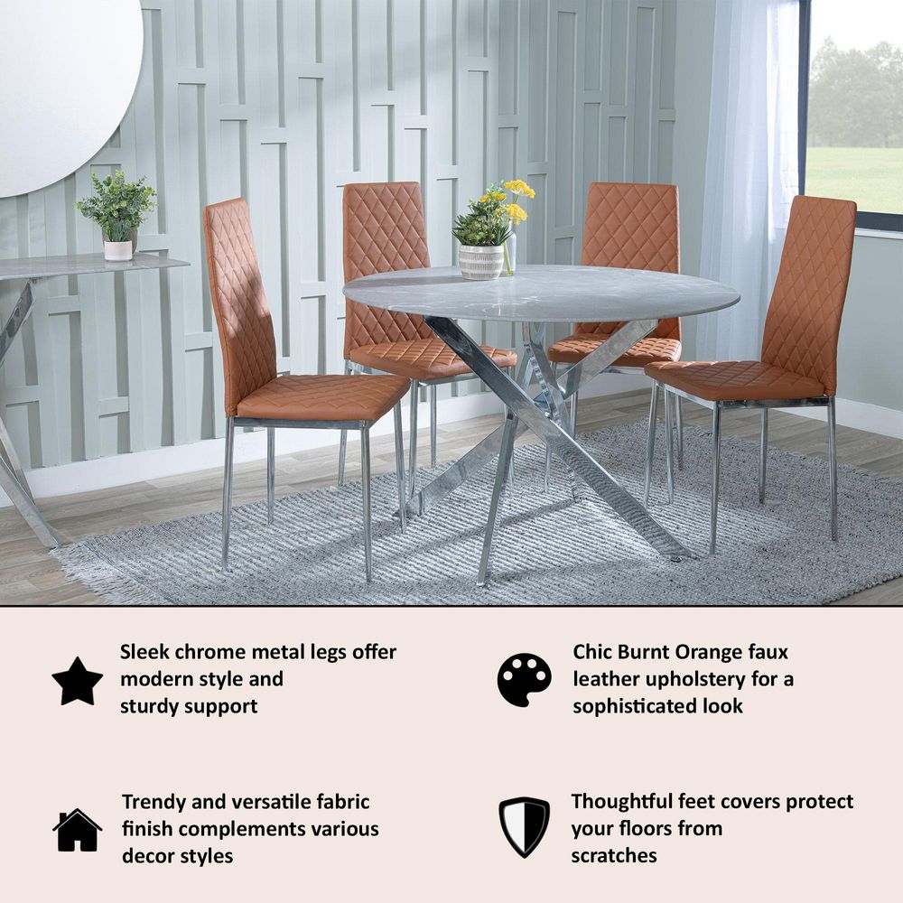 The Metro Dining Chair in Burnt Orange is a striking yet sophisticated addition to any dining space. Upholstered in soft, high quality faux leather with a rich burnt orange tone, this chair brings warmth and character while maintaining a modern, polished look. The slim, ergonomic backrest is designed for both comfort and posture support, making it ideal for everything from daily meals to long evening gatherings.