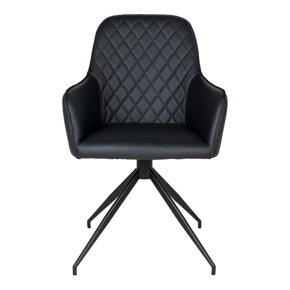 Crafted from premium faux leather in a deep, polished black, the Harbo chair offers excellent durability and easy upkeep. The diamond stitching pattern on the backrest adds depth and texture, reflecting careful workmanship and attention to fine detail. The backrest sweeps outward into built-in armrests, creating a secure and supportive seat that invites relaxed dining. The sturdy black metal legs bring a Contemporary edge while ensuring stability and long-lasting performance.