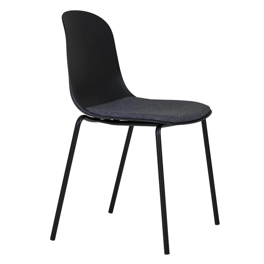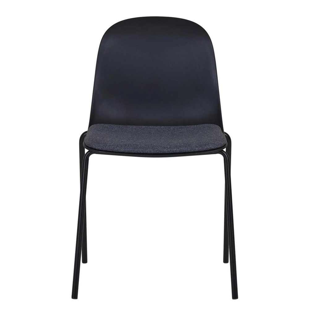 Each chair features a gently moulded seat and backrest upholstered in black polyester fabric, offering both softness and resilience. The smooth contours of the seat provide ergonomic support, while the splayed steel frame—finished in matte black—adds a refined industrial edge. Built to last, the Madalena chair is not only sturdy but also stackable, making it a versatile choice for both compact dining areas and spacious settings.