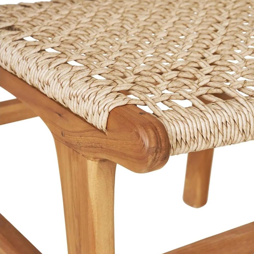 Each chair features a straight, mid-height backrest and a gently contoured seat, crafted from durable PE (polyrattan) synthetic rope intricately woven by hand. The warm tones of the natural or beige rope contrast beautifully with the solid teak wood frame, which offers strength, stability, and an organic character that develops a graceful patina over time. Naturally resistant to weather, rot, and insects due to the teak’s natural oils, the Derby chair is suitable for both indoor and covered outdoor spaces.
