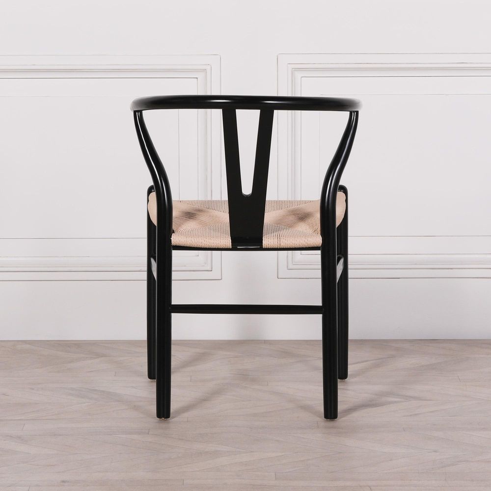 Item Code: WDC960 Black painted wooden dining chair in a wishbone design handcrafted from wood with a weaved seat and arm rest. (Does not require assembly)