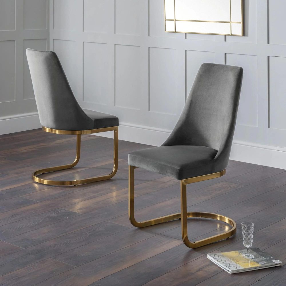 Item Code: VIT001 The Vittoria Cantilever chair brings sophistication and class to your home. With a golden U-shaped base and elegant velvet upholstery ? this chair provides a classic touch to any dining area. The solid metal base adds great stability whilst the high backrests are supportive and comfortable. Available in grey or blue.?