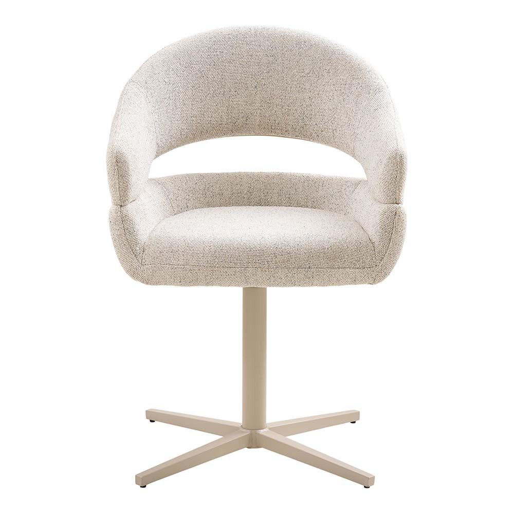 The curved seat form supports the body naturally, while the swivel and return function adds subtle movement that feels effortless and convenient. Upholstered in a warm beige melange polyester fabric, the seat and backrest provide a textured, comfortable surface with long-lasting durability. The subtle contouring ensures ergonomic support, encouraging comfortable seating throughout any gathering.
