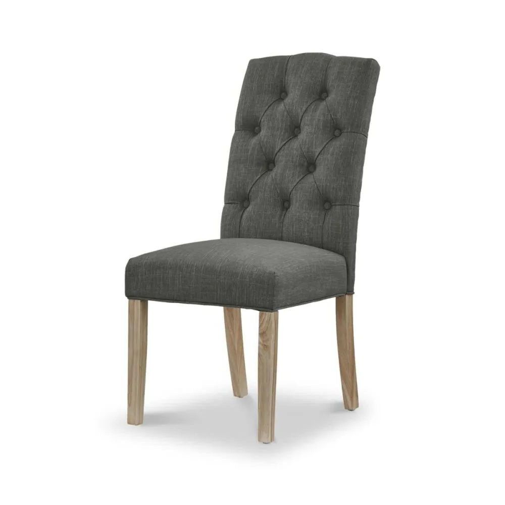 The chair’s chunky wooden legs and frame reflect a sturdy construction, while the luxurious button-tufted backrest and deeply padded seat provide comfort for long meals and gatherings. Its charcoal fabric upholstery adds a touch of sophistication, complementing a range of interiors from country chic to modern classic.