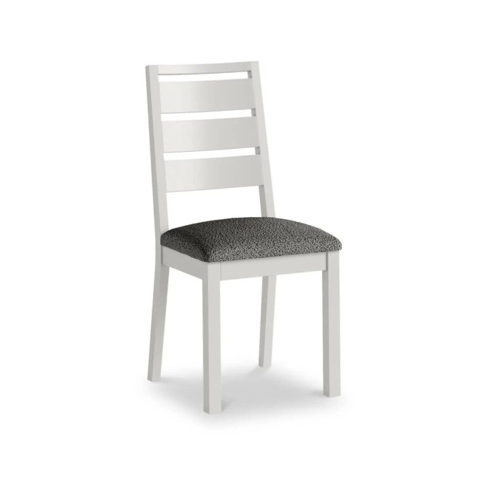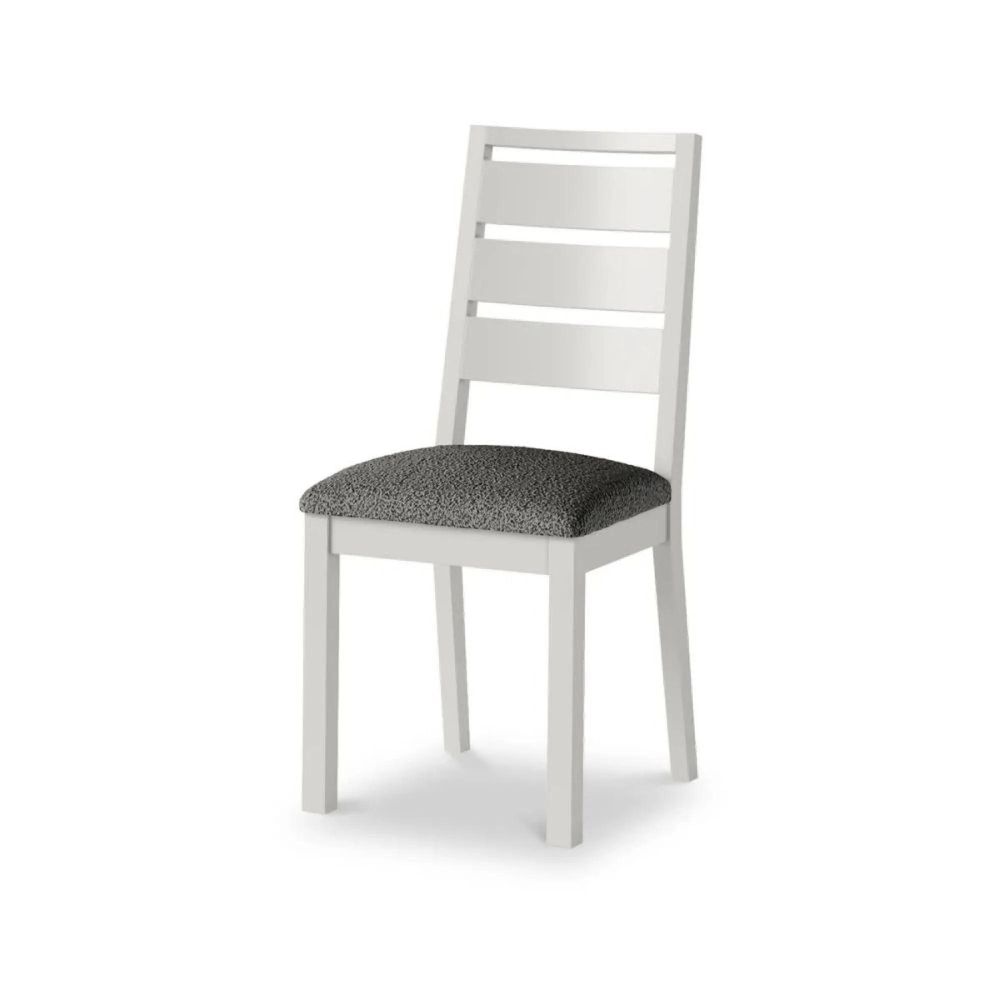 The frame features a refined Modern Grey Painted finish, while the seat and back are upholstered in soft white boucle fabric, providing a luxurious, textured look and comfortable seating. The slatted back design adds a subtle decorative touch and ensures excellent support, making this chair ideal for everyday dining or special occasions.
