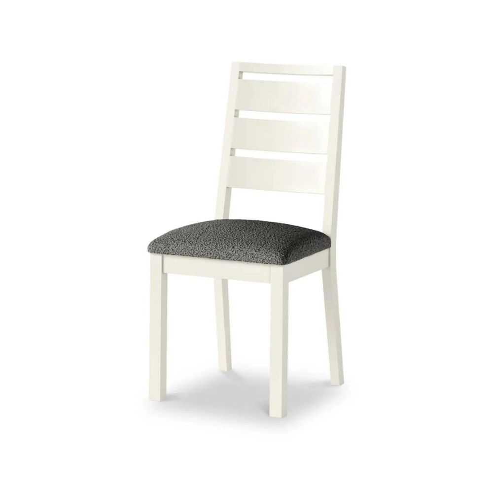 The chair features a slatted back design for subtle visual interest and ergonomic support, while the boucle fabric upholstered seat provides a soft, textured surface that is both comfortable and durable. Available in grey boucle fabric, it offers a contemporary contrast to the painted frame, which is finished in coconut white or light grey.