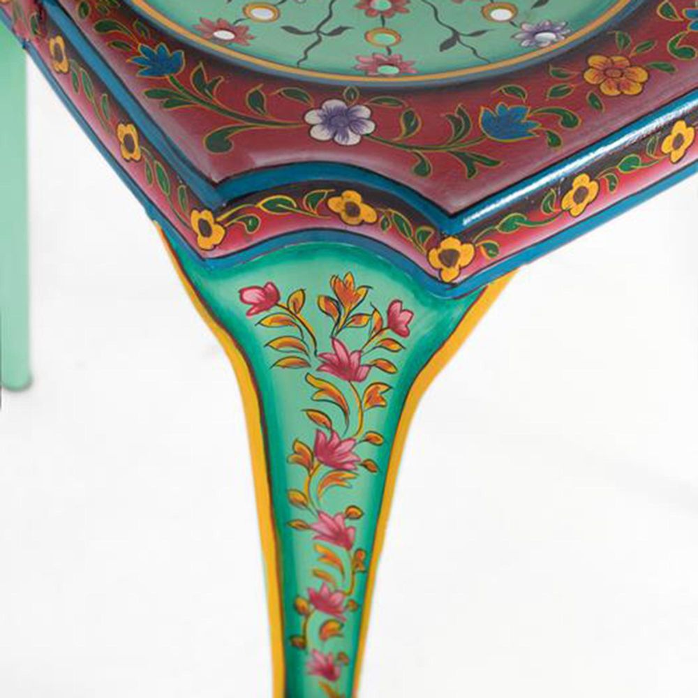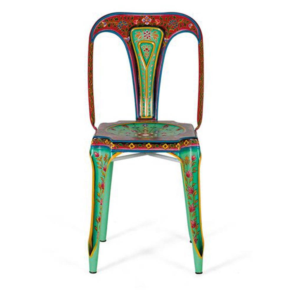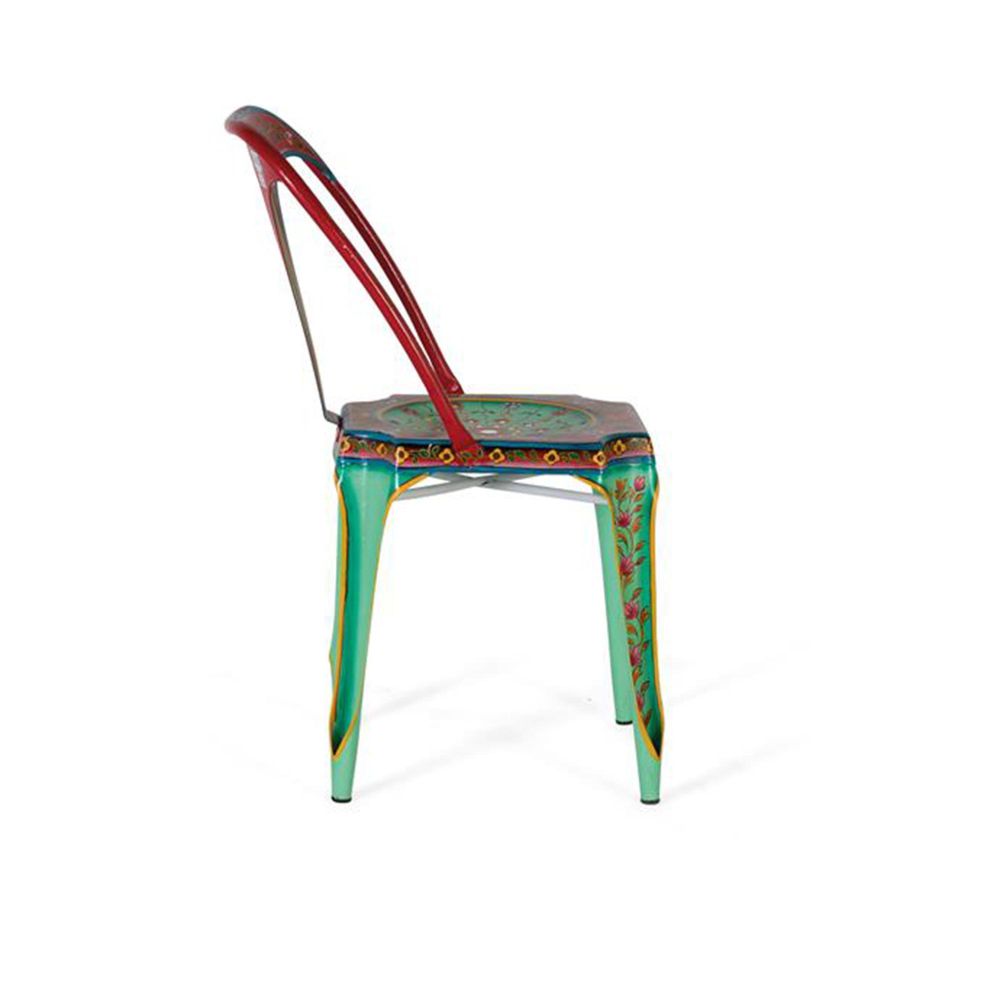 Set of 2 chairs made of hand-painted metal, they include non-slip pads that prevent movement and protect the floor from scratches.