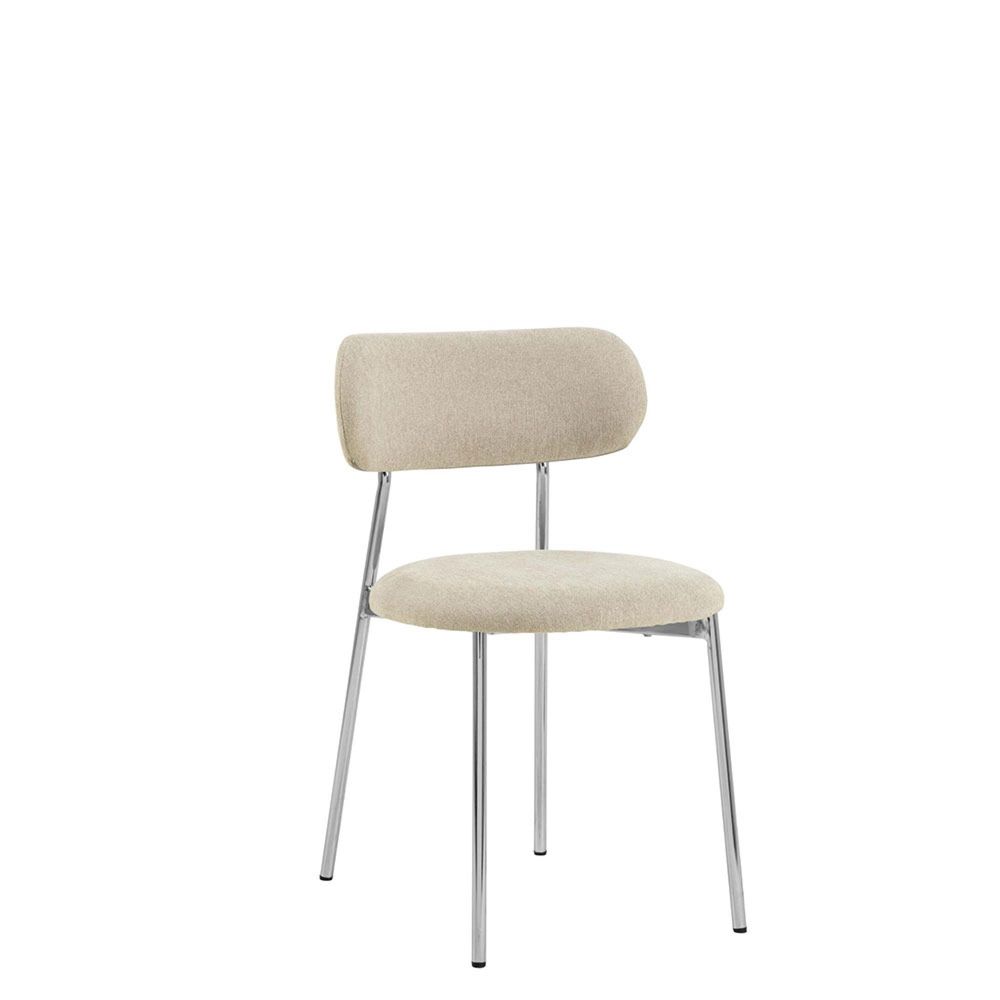 Lyric dining chair, Apia fabric sand 140 FR, base chrome steel, box 2 pcsThis dining chair embodies the retro-futuristic aesthetic, injecting playfulness into any dining room. Its tubular frame and legs are made from shiny chromed steel. To enhance the soft side of the design, the rounded seat is covered in a chenille-like beige fabric. It is an eye-catching design that brings excitement to the dining table.