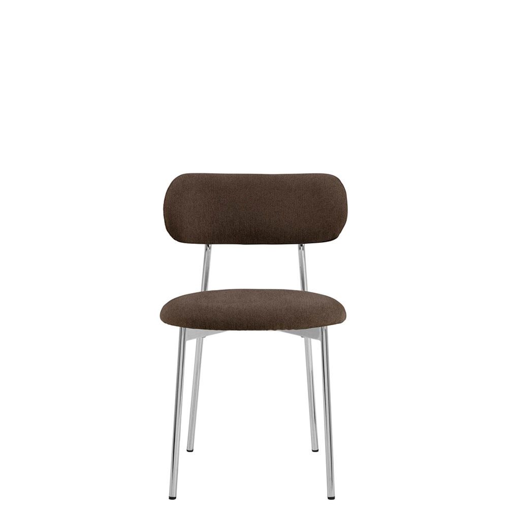 Lyric dining chair, Apia fabric brown 442 FR, base chrome steel, box 2 pcsThis dining chair embodies the retro-futuristic aesthetic, injecting playfulness into any dining room. Its tubular frame and legs are made from shiny chromed steel. To enhance the soft side of the design, the rounded seat is covered in a chenille-like brown fabric. It is an eye-catching design that brings excitement to the dining table.