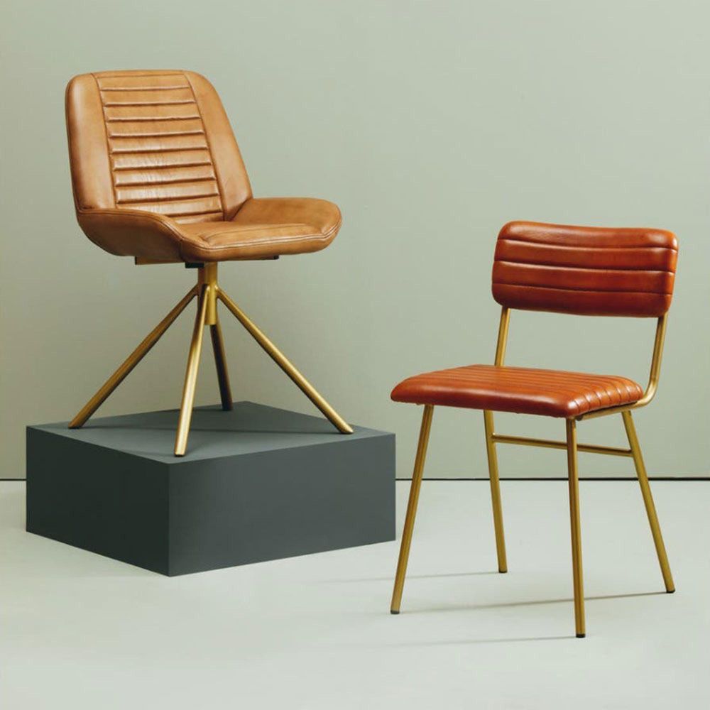 Item Code: 5529638 The Buffalo dining chair combines tan leather, subtle channel tufting, and a sleek gold finish iron frame to create a modern statement. This dining chair has a soft padded seat and backrest, upholstered in genuine tan leather featuring horizontal channel tufting. The seat and backrest are complemented by the sleek angular gold finish iron frame.