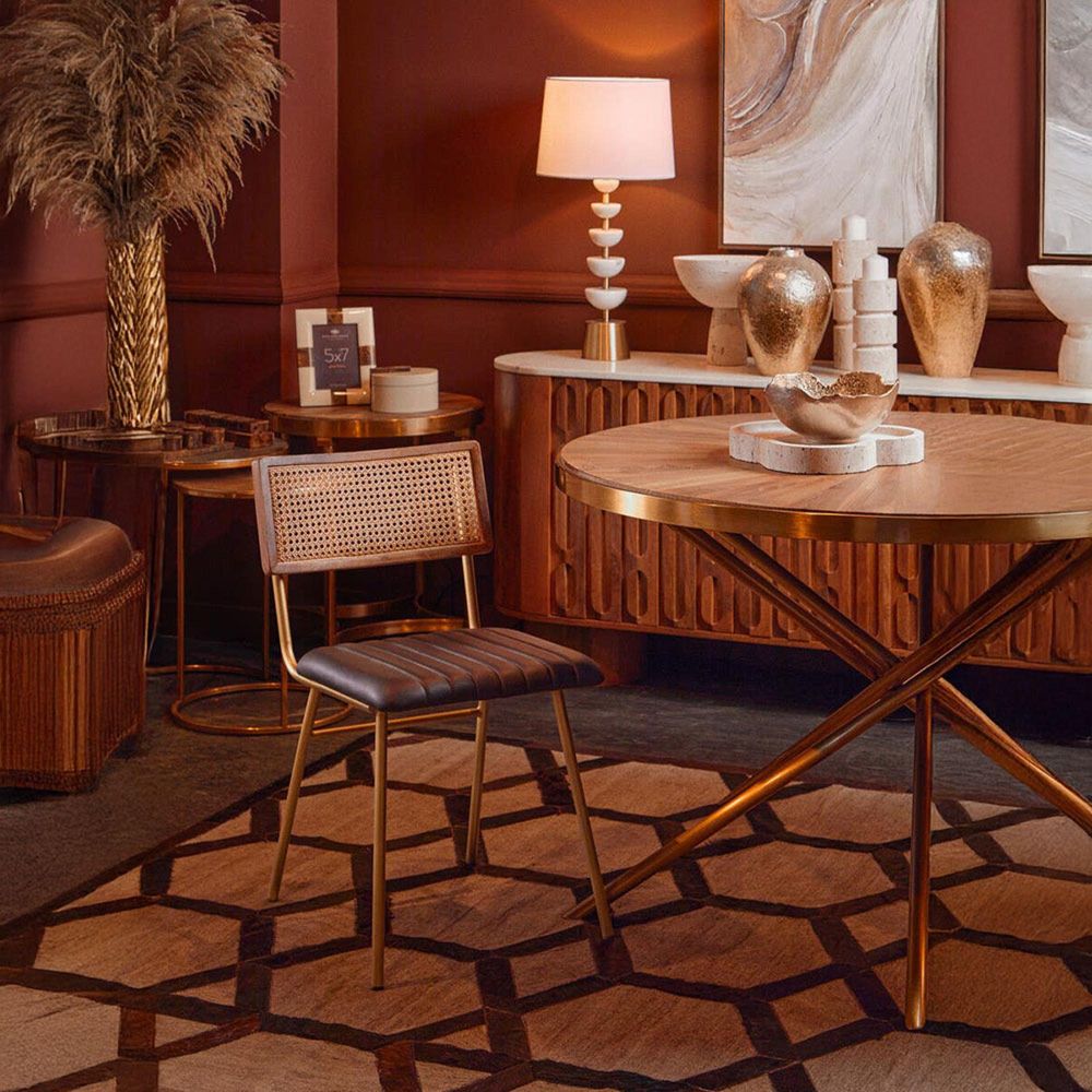 Item Code: 5529635 The Buffalo black leather dining chair features a retro aesthetic with a cane webbed backrest and luxe gold finish iron legs. This dining chair creates a stylish look with a mix of modern elements. The padded seat is upholstered in genuine black leather, featuring channel tufting, which contrasts elegantly with the gold finish iron legs.