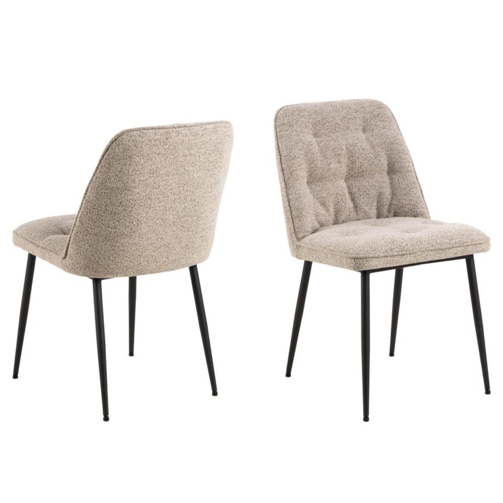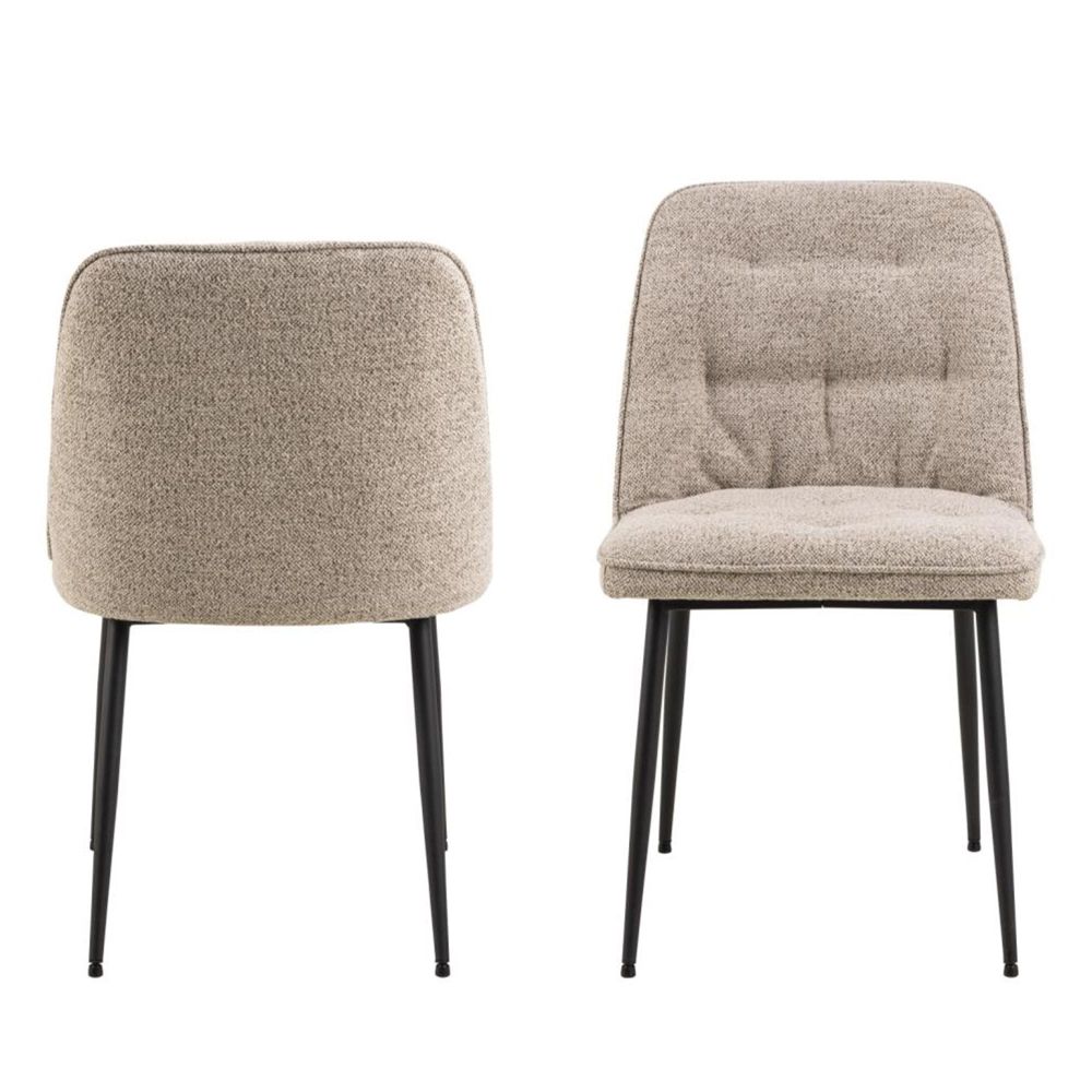 Item Code: 107639 Brooke dining chair, Monza fabric beige 60 FR, base matt black rough powder coated steel with tufting's, box 2 pcs. Add character to your dining area with this elegant dining chair. Its timeless silhouette is upholstered in a soft beige boucle-like fabric, offering a rich tactile experience. Resting on round black steel legs, the chair is also decorated with tufting for extra layer of texture. It is made for everyday dining and special moments. Made of fire-resistant materials.Free Delivery
