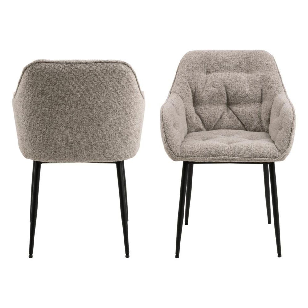 Item Code: 107642 Brooke dining chair with armrest, Monza fabric beige 60 FR, base matt black rough powder coated steel with tuftings. Highlight the character the dining area with this beige dining chair with armrests. Its clean silhouette is wrapped in a soft boucle-like fabric, making the seat pleasant to sit in as well as look at. By adding the tufting detail, the chair gains texture. To complete the elegant look, the chair stands on slim yet strong black steel legs. Made of fire-resistant materials.Free Delivery