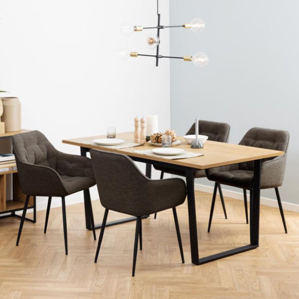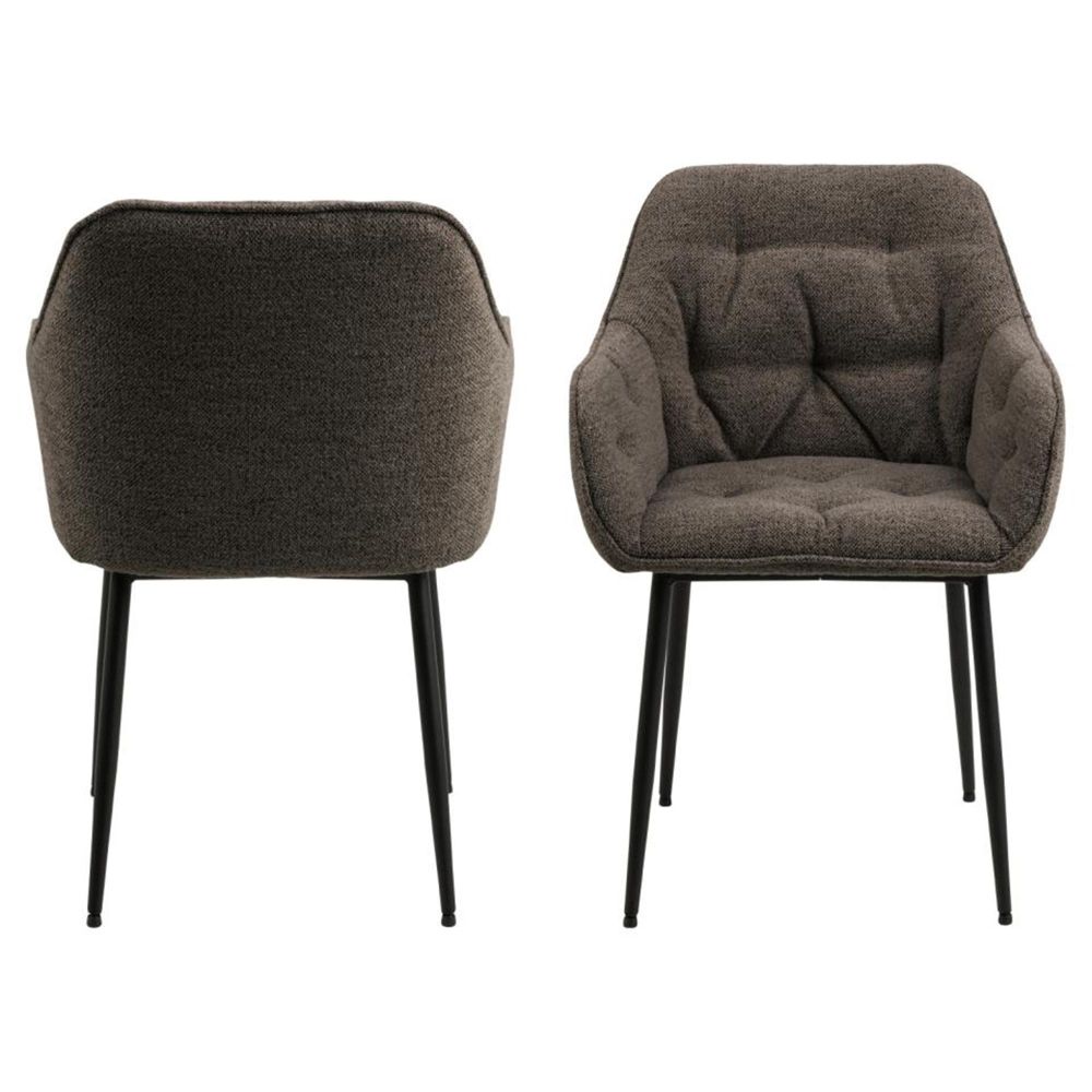 Item Code: 107643 Brooke dining chair with armrest, Monza fabric taupe 40 FR, base matt black rough powder coated steel with tuftings. Highlight the character the dining area with this taupe-coloured dining chair with armrests. Its clean silhouette is wrapped in a soft boucle-like fabric, making the seat pleasant to sit in as well as look at. By adding the tufting detail, the chair gains texture. To complete the elegant look, the chair stands on slim yet strong black steel legs. Made of fire-resistant materials.Free Delivery