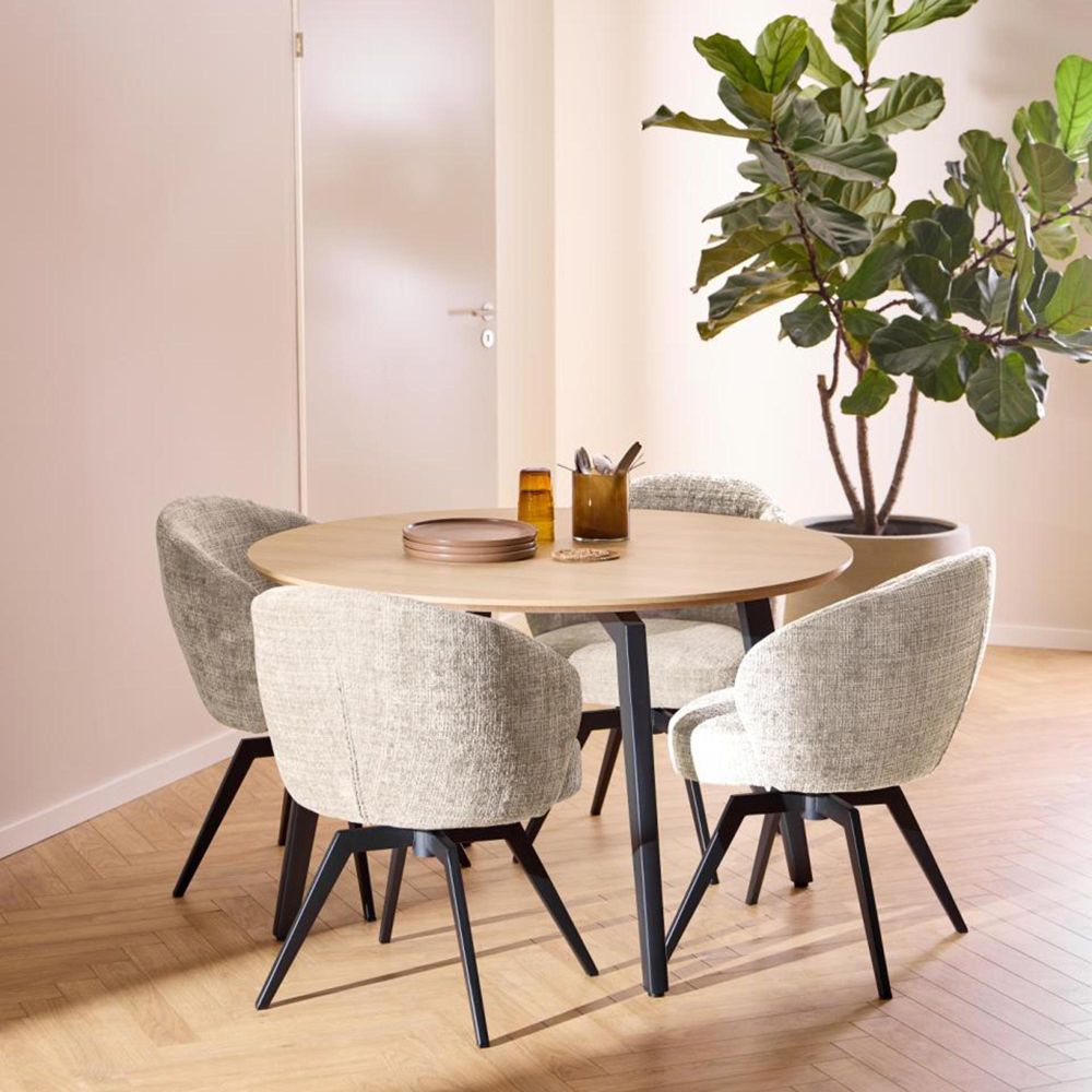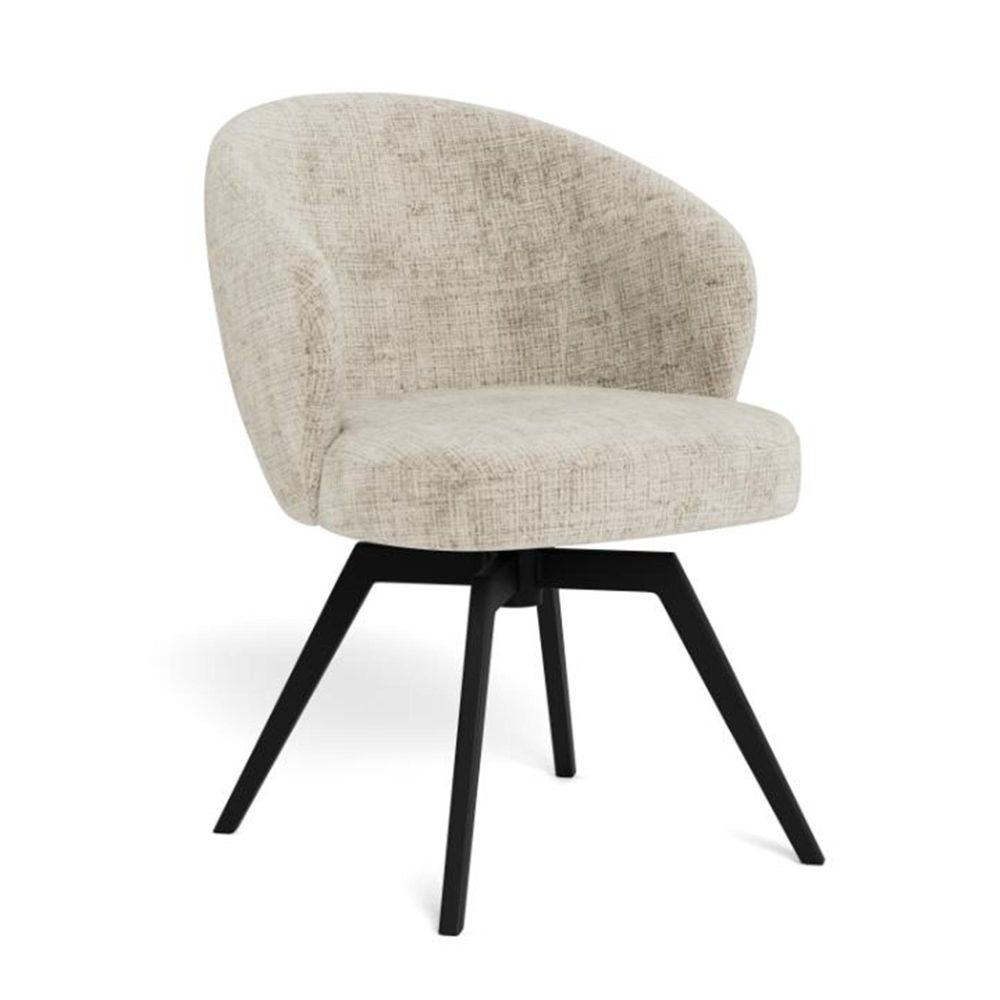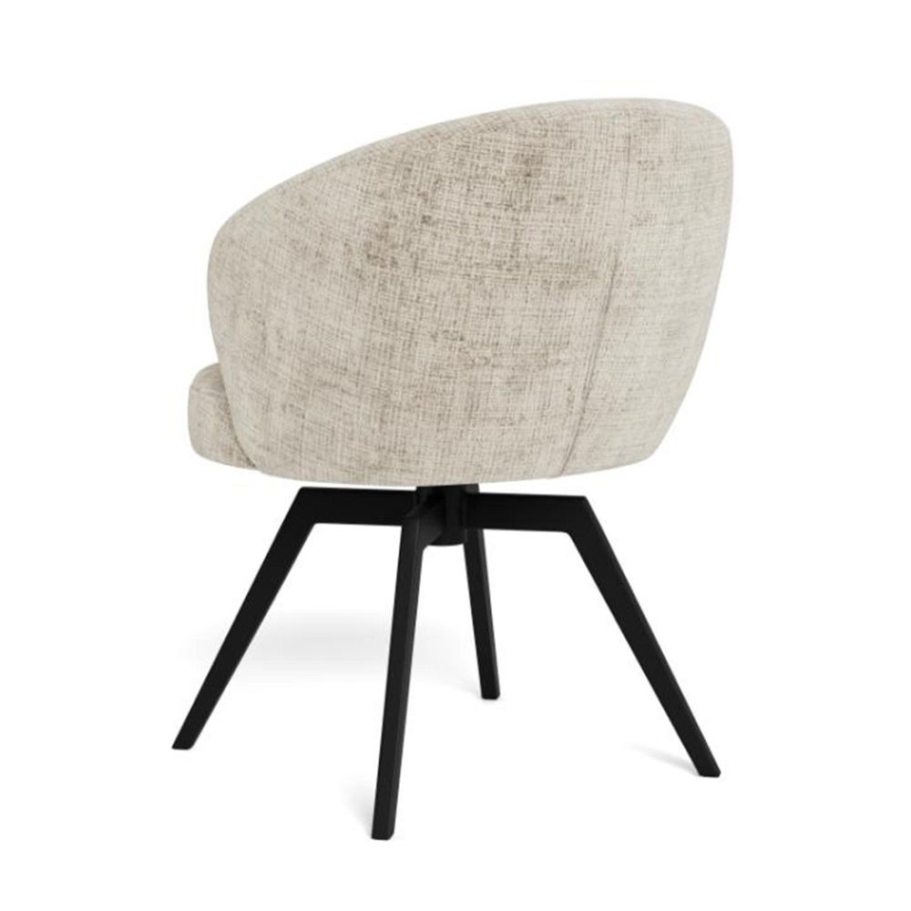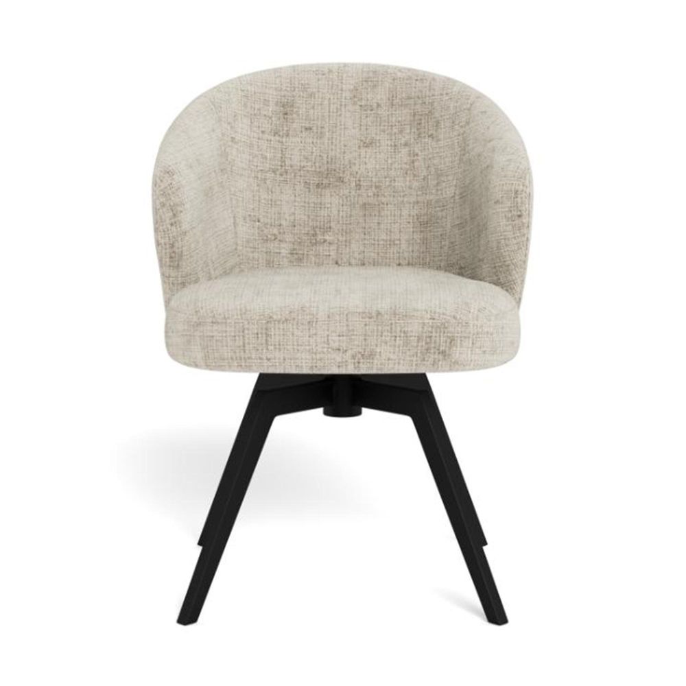 Item Code: 109362 Darlene dining chair with armrest, Juto fabric beige 4 FR, base matt black rough powder coated steel with 3 fields stitchings, auto-return, pocket springs, swivel and zip. This dining chair with armrests embodies a modern design without compromises. Its sleek, rounded seat is wrapped in a soft beige fabric with vibrant texture. Featuring pocket springs, the chair provides great seating comfort and includes swivel and auto-return functions for easier movement with minimal effort. Dining chair made of fire-resistant materials. FSC certified.Free Delivery