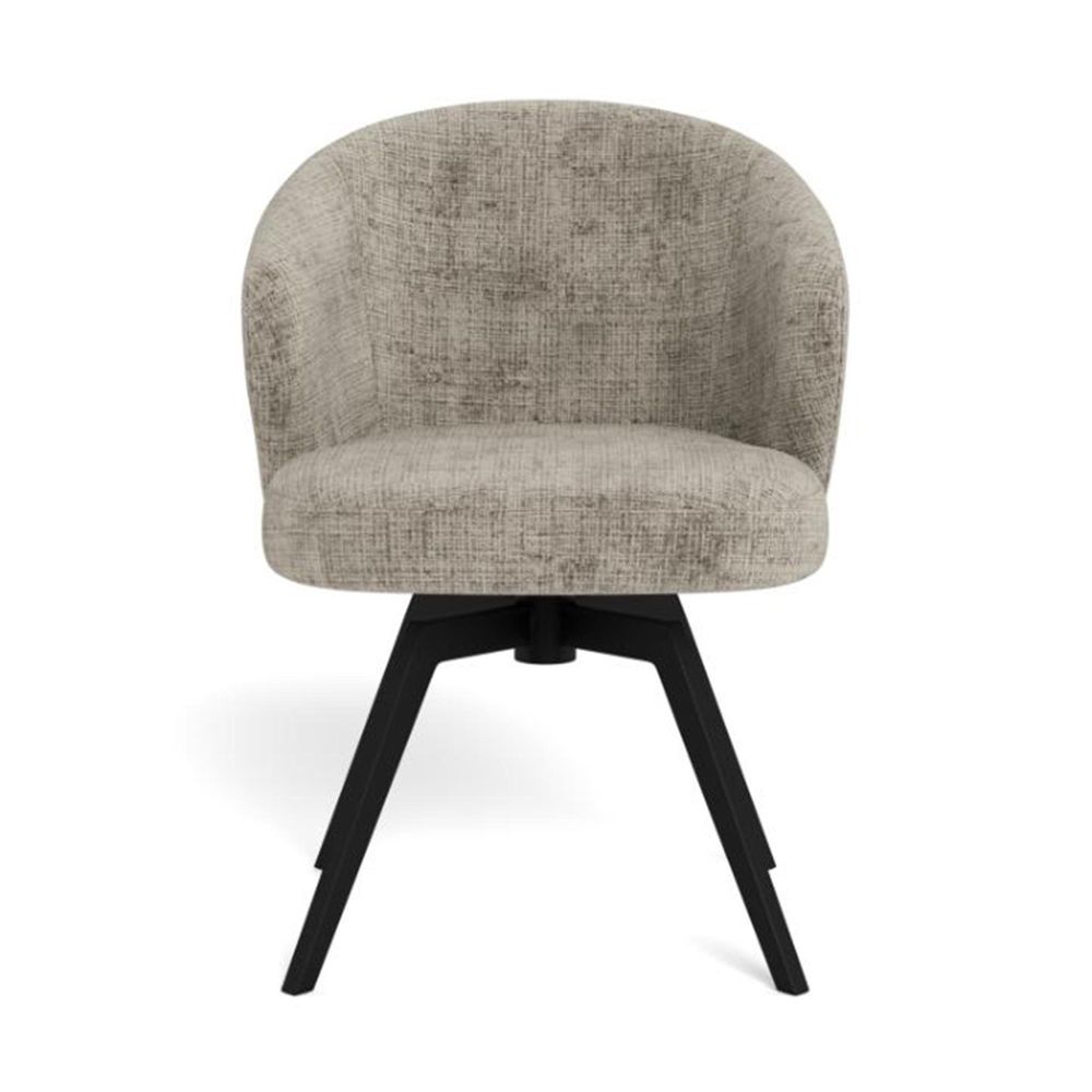 Item Code: 109363 Darlene dining chair with armrest, Juto fabric grey 85 FR, base matt black rough powder coated steel with 3 fields stitchings, auto-return, pocket springs, swivel and zip. This dining chair with armrests embodies a modern design without compromises. Its sleek, rounded seat is wrapped in a soft grey fabric with vibrant texture. Featuring pocket springs, the chair provides great seating comfort and includes swivel and auto-return functions for easier movement with minimal effort. Dining chair made of fire-resistant materials. FSC certified.Free Delivery