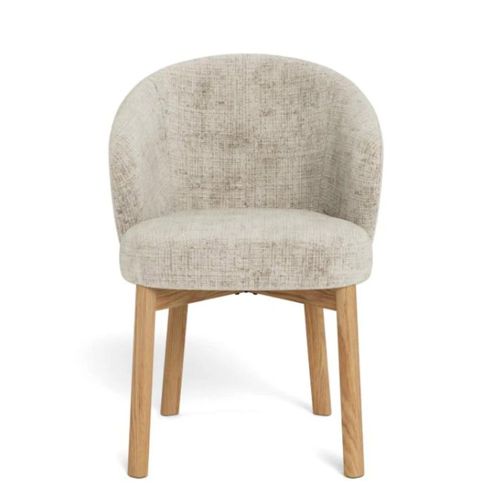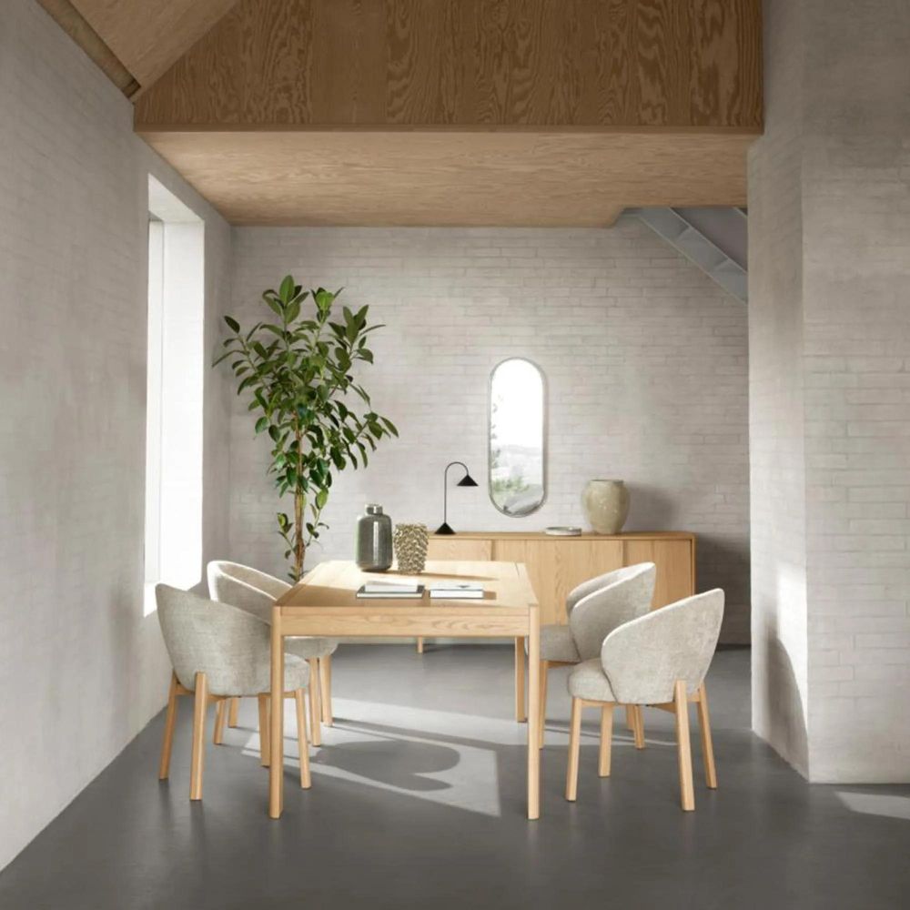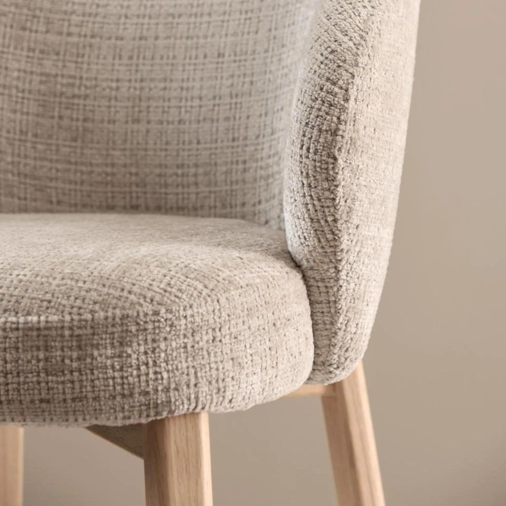 Item Code: 109540 Darlene dining chair with armrest, Juto fabric beige 4 FR, base matt oak NC lacquered with 3 fields stitchings and pocket springs, box 2 pcs. This dining chair with armrests embodies a modern design without compromises. Its sleek, rounded seat is wrapped in a beige fabric with a vibrant, textured surface. Featuring pocket springs, the chair provides great seating comfort. Paired with round oak legs finished with lacquer, this design imbues with warmth and sophistication. Made of fire-resistant materials. FSC certified.Free Delivery