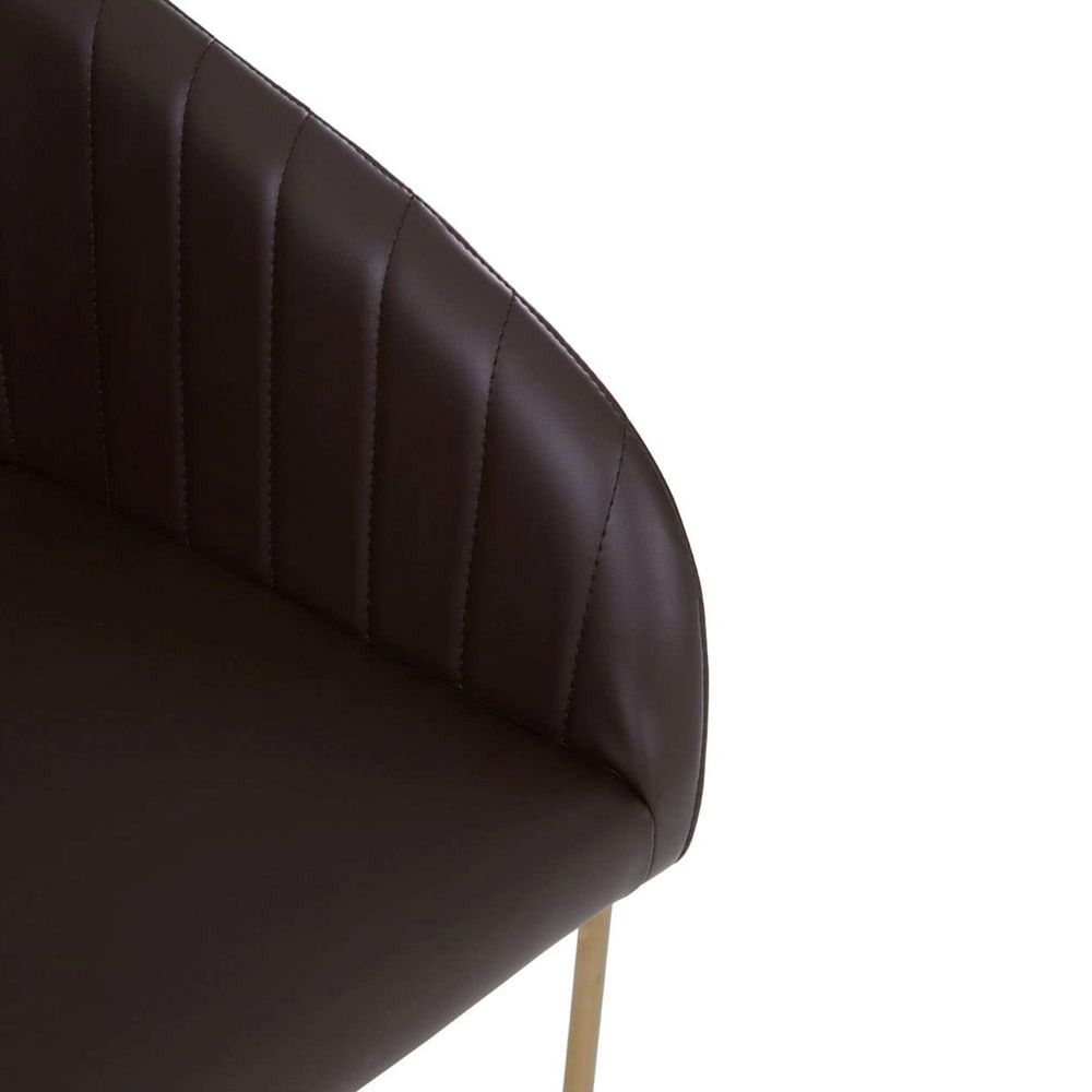 Item Code: 5527241 A dining chair with an elegant slim profile and channel tufted backrest.The seat is upholstered with soft brown faux leather, and its lines are inspired by classic tub chair design. Its legs are made from smooth stainless steel and are finished in brass to complement the brown.