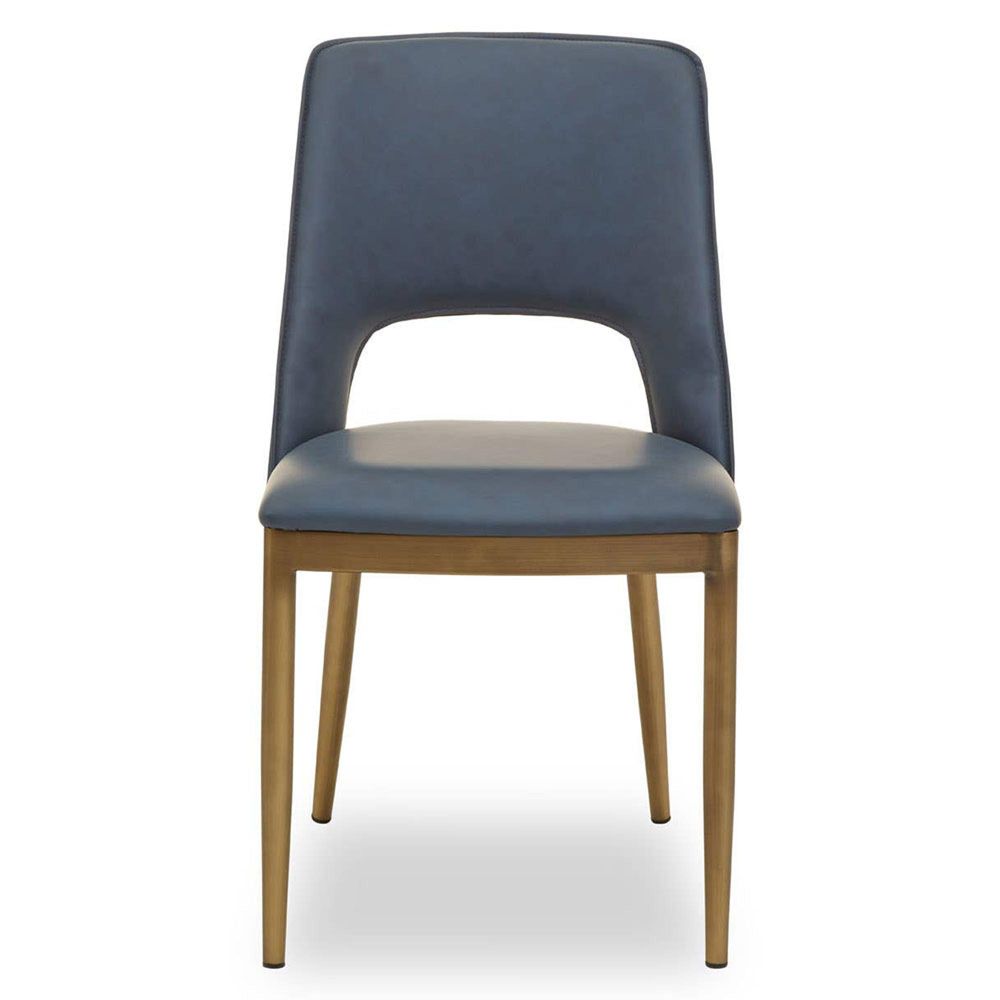 Item Code: 5528216 The Gilden dining chair brings a pop of colour to the dining area with its blue leather effect upholstery. It has brass finish legs for a luxe look.This dining chair has a padded seat upholstered in the blue leatherette that matches the contoured back with a cut out for lumber support. The slanting legs in the brushed antique brass finish complete the retro aesthetic.