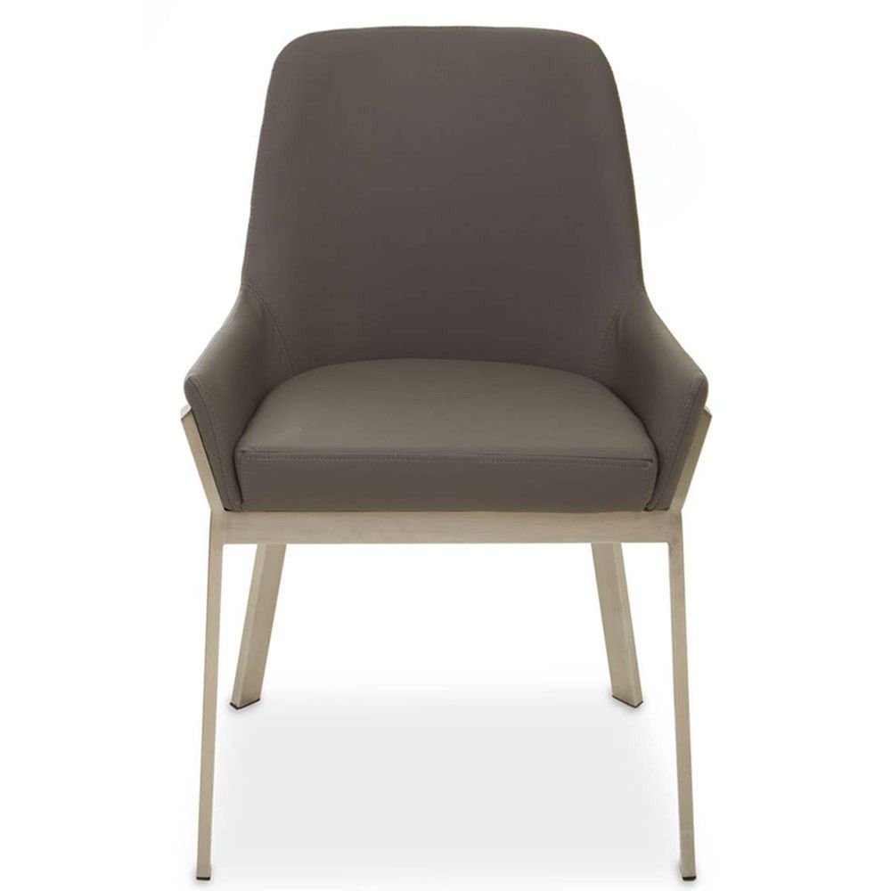 Item Code: 5528223 Give a touch of luxury to home decor with this chair upholstered in bonded leather with diamond stitching.This chair has a soft padded seat with flared arms and a tapered backrest. The grey leatherette contrasts the sleek and angular legs in brushed silver finish that create an elegant look.