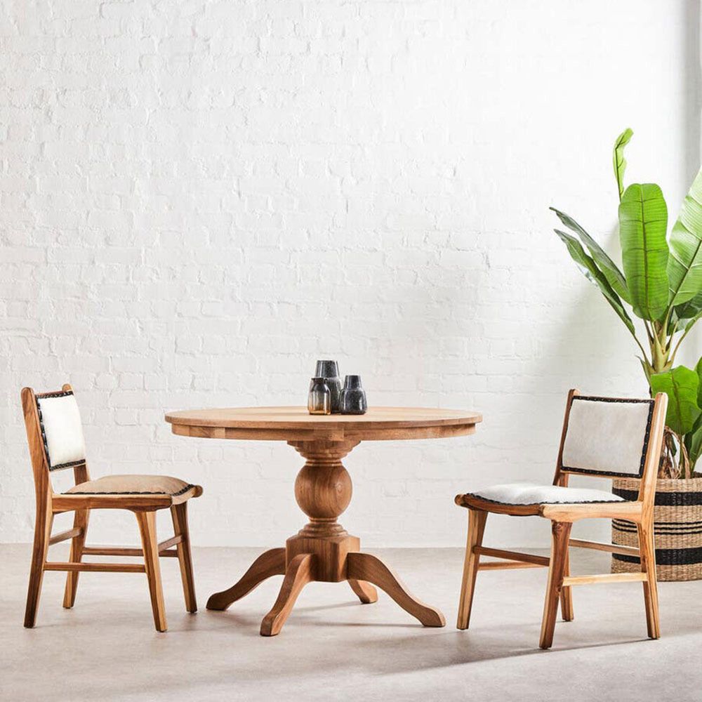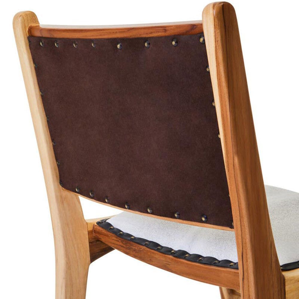 Item Code: 5527082 The Kendari dining chair is classically upholstered with natural cow leather, metal nail head trim for a rich designer look, open back and arms lend a slight light airy feel.Kendari natural cow leather upholstery makes a statement in any decor. Its simple silhouette is entirely made of teakwood in a walnut finish, with leather and stud trim detail this chair with its boho feel will complement any living space in your home.