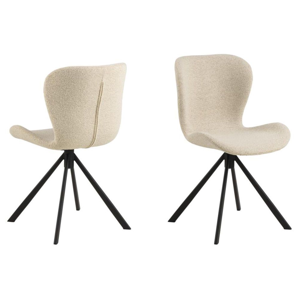 Item Code: 103478 Batilda -A1 dining chair, Monza fabric cream 90 FR, 4-star base matt black rough powder coated steel with swivel, zigzag stitchings and zip, box 2 pcs. This dining chair effortlessly balances style, comfort and practicality. Upholstered in a soft cream boucle fabric, the seat provides a comfortable seating experience. When combined with a black steel swivel base, the chair with zig-zag stitching infuses any dining space with a modern aesthetic. Made of fire-resistant materials.Free Delivery