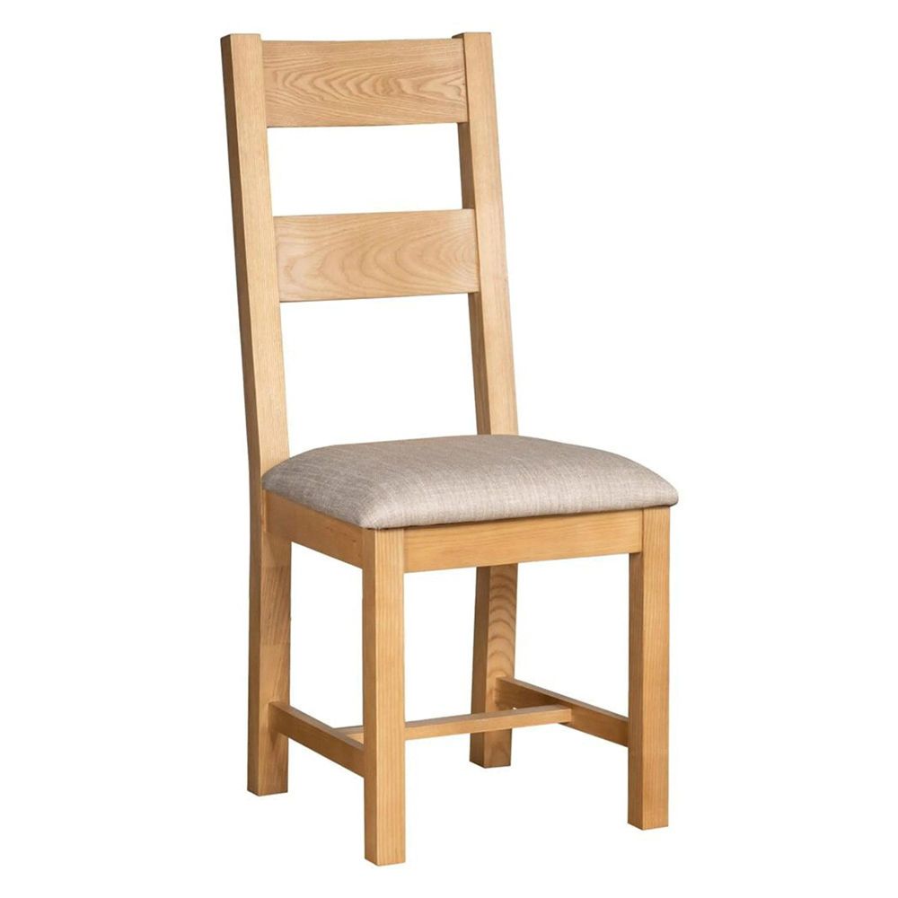This stylish and classic ladder back dining chair is sturdy and reliable and features a beige fabric seat pad. It matches perfectly with any of our light oak ranges.