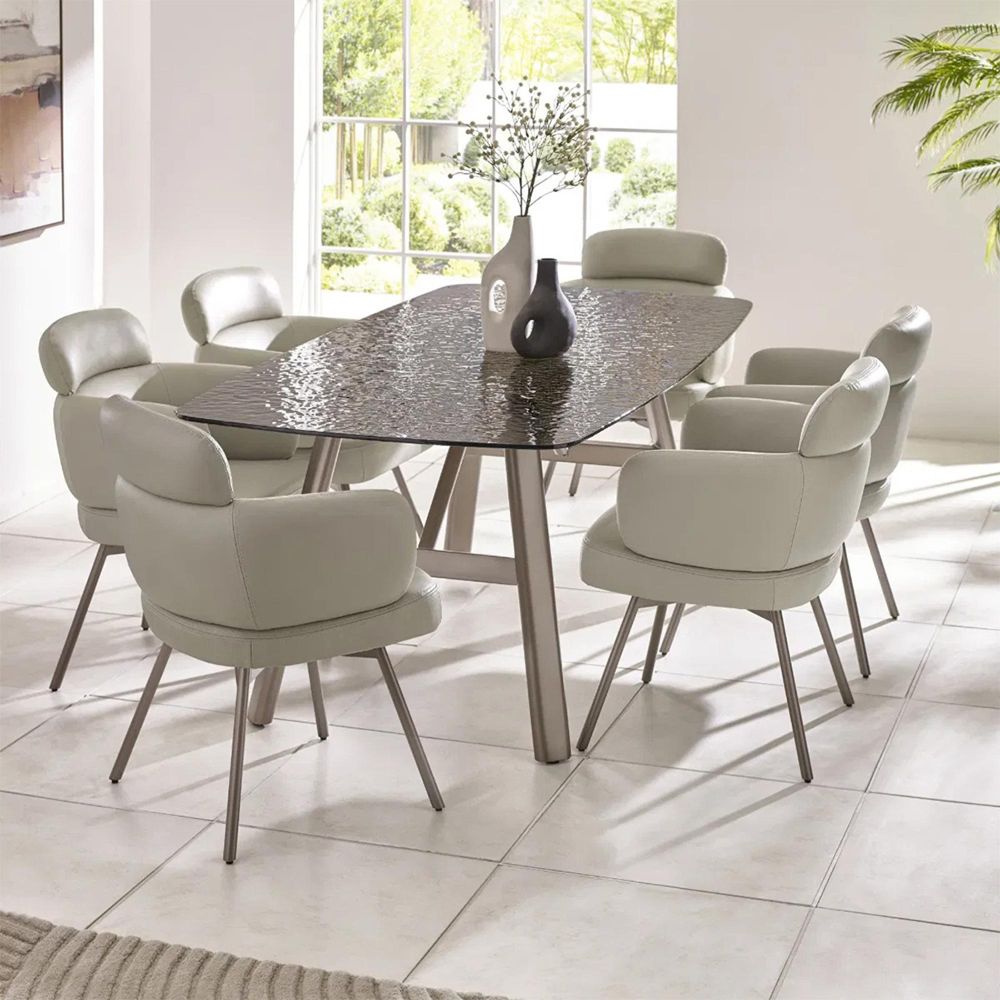 Item Code: CAL011 Bring modern comfort and style to your dining space with this set of two swivel dining chairs. Upholstered in soft beige faux leather, each chair features generously padded cushioning, a curved backrest, and padded armrests for all-around support. The 180-degree swivel base with auto-return makes moving in and out effortless, while tapered brushed bronze legs add a sleek, contemporary touch. Stylish, versatile, and practical, this pair is perfect for dining, entertaining, or relaxing, Self assembly required.