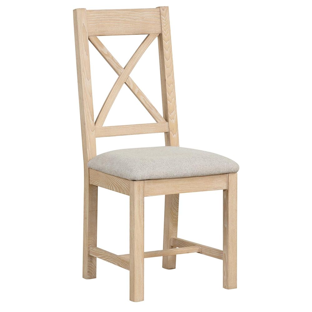 Item Code: WIL150 This stylish dining chair features a cross back design, which is cosy and comfortable due to its high back. For added comfort it has a light grey padded seat. Made from solid Ash and finished in our pale white-washed matt lacquer.