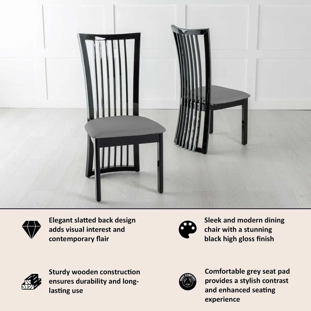 The black high-gloss finish creates a striking, contemporary look, while the slatted back design—with extended slats flowing seamlessly down to the feet—adds visual height and sophistication. A padded grey fabric seat offers softness and ergonomic support, ensuring your comfort from appetisers to dessert.