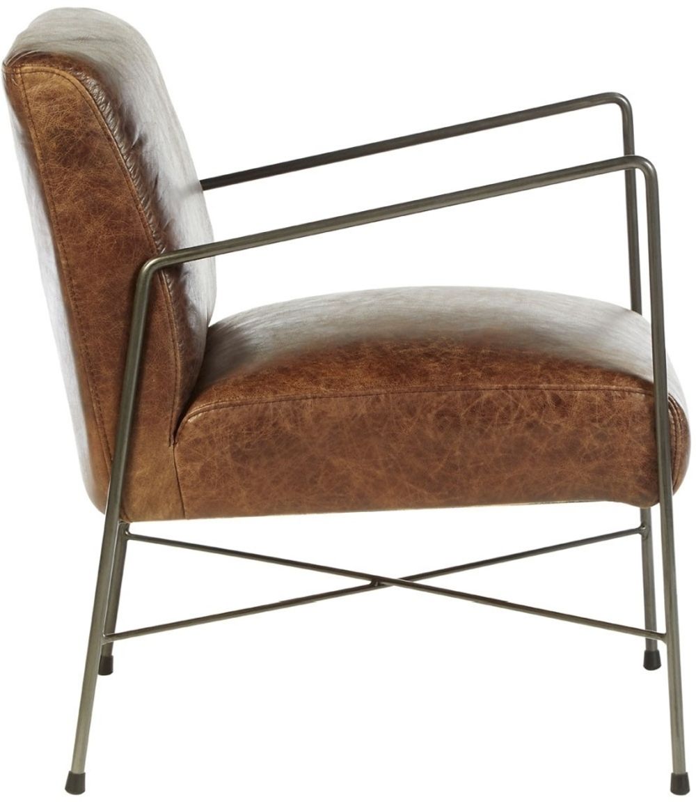 Item Code: 5502208 The Hoxton dining chair's simplistic design and paired back use of materials lends it to minimalistic industrial style interiors.The Hoxton dining chair's minimal frame is made from slender cylinders of dark iron, lending it a soft industrial edge. Two overlapping strips of iron create a cross effect, joining the four legs at their mid-point. Plump, stuffed cushions upholstered in genuine brown leather create a comfortable seat and backrest, while their prominent distressing lends a natural juxtaposition to the metallic frame.