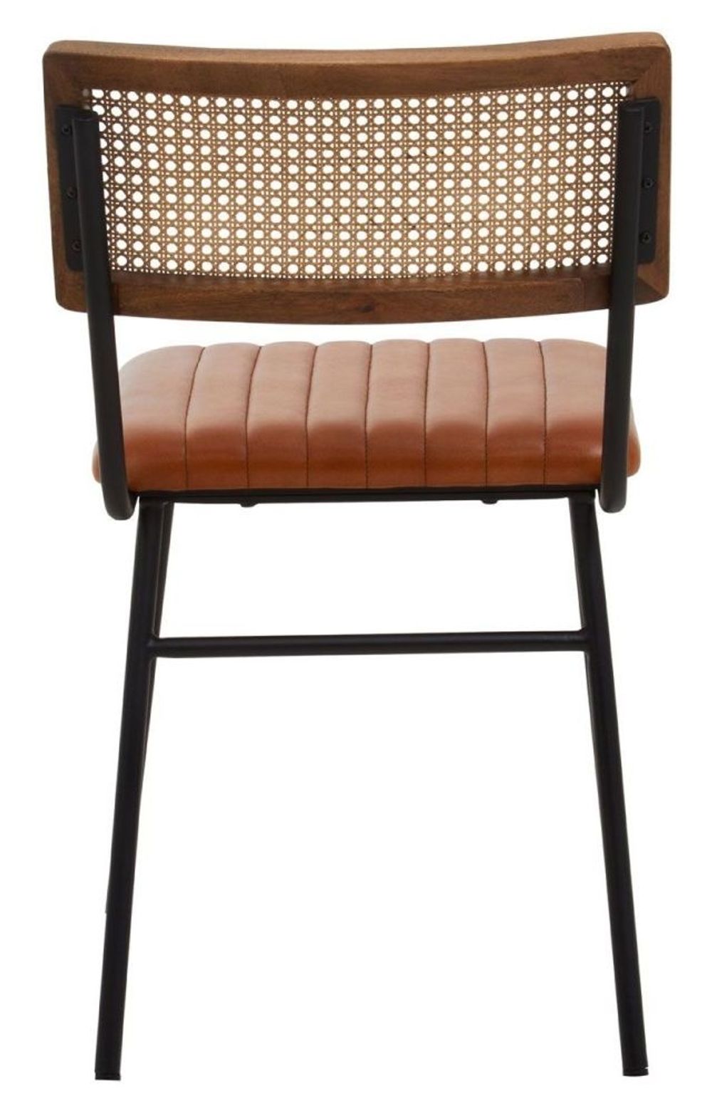 Item Code: 5529634 The Buffalo tan genuine leather dining chair has a retro cane webbed back rest and a sleek black iron frame.This dining chair creates a stylish look with a mix of modern elements. The padded seat is upholstered from tan genuine leather, featuring channel tufting, and is supported by a sleek black iron frame, which contrasts the high backrest with cane webbing.