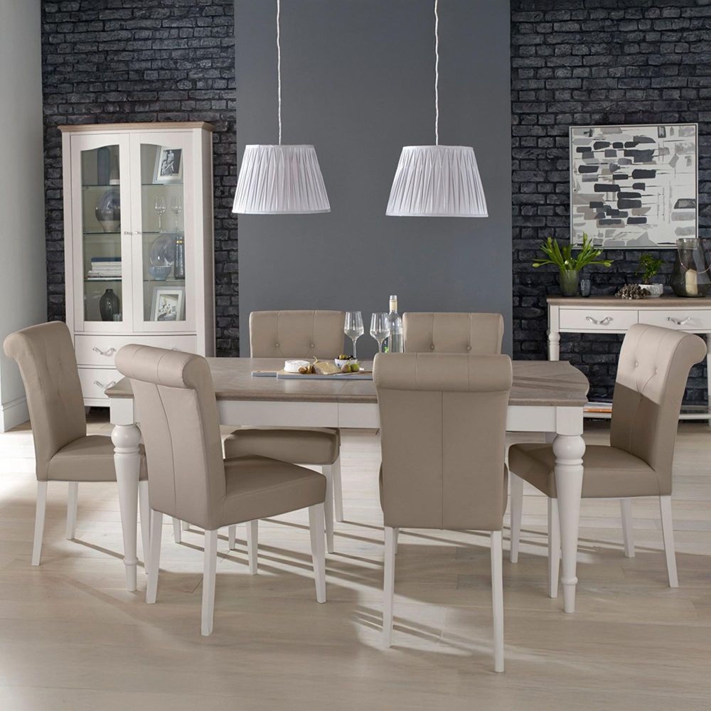 Item Code: 6290-09UB-GR With drama and sophistication in abundance, Montreux boasts beautiful form by way of serpentine framed tops, gently bow-fronted cabinet & classically styled turned legs. Bespoke handles, intricate oak marquetry tops and large roll back upholstered chairs all add to the uncompromising design detail which together with the combination of striking grey washed oak tops contrasting with soft grey pigment frames will ensure this range makes a striking statement in any home. Quality touches such as soft closing drawers for the cabinet and reciprocal extension runners for the dining tables epitomise the best of contemporary styling and everyday use.