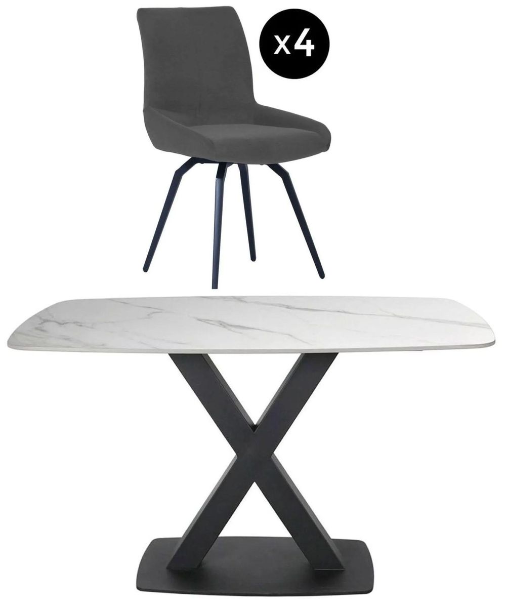 The dining table features a rectangular sintered stone top with soft curved edges, resting on a striking black powder-coated metal pedestal base. This sleek cross-design base adds stability while providing a refined contrast to the smooth white top. Paired with four Malcom swivel dining chairs in dark grey fabric, the set balances modern lines with inviting comfort.