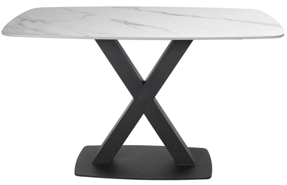 The dining table features a white sintered stone top – a material celebrated for its strength, resilience, and beauty. Unlike traditional surfaces, sintered stone is resistant to scratches, stains, heat, and moisture, making it as practical as it is stylish. The smooth rectangular top with curved edges sits on a black powder-coated cross pedestal base, creating a striking contrast that works beautifully in modern interiors.
