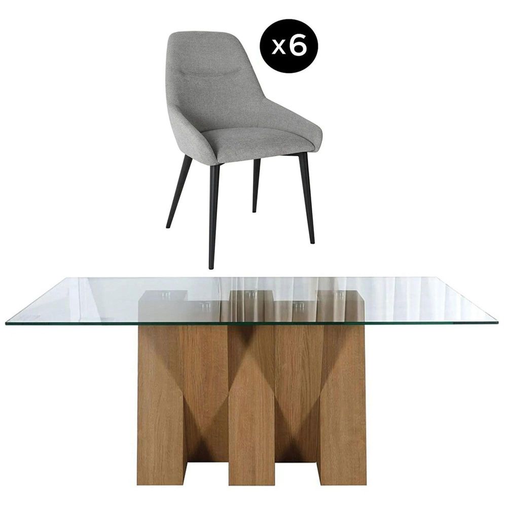 The centrepiece of the set is the tempered clear glass table, supported by a uniquely crafted oak-effect wrapped pedestal with a piston-inspired design. The smooth glass surface is non-porous and exceptionally easy to maintain, making it a practical choice for everyday living while retaining a polished, modern look.