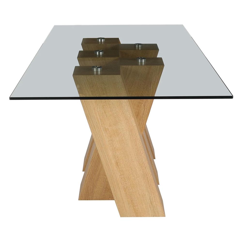 Crafted from tempered glass with a durable MDF oak-effect wrapped pedestal