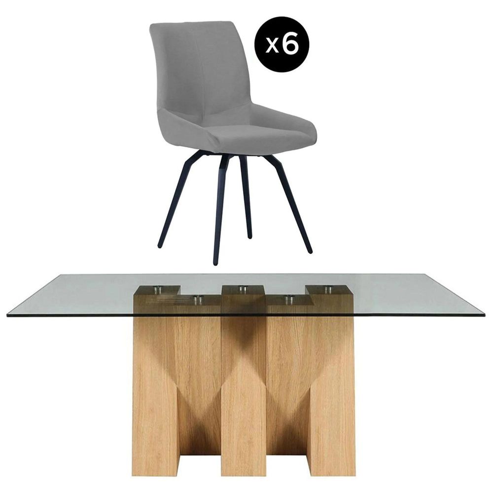 Bring a sophisticated, modern touch to your dining area with the Newton 6 Seater Dining Set. Featuring a smoked tempered glass tabletop and a natural oak-effect pedestal, this set combines contemporary style with practicality. The Malcom swivel chairs, upholstered in soft grey fabric, offer comfort and elegance for everyday meals or special gatherings.