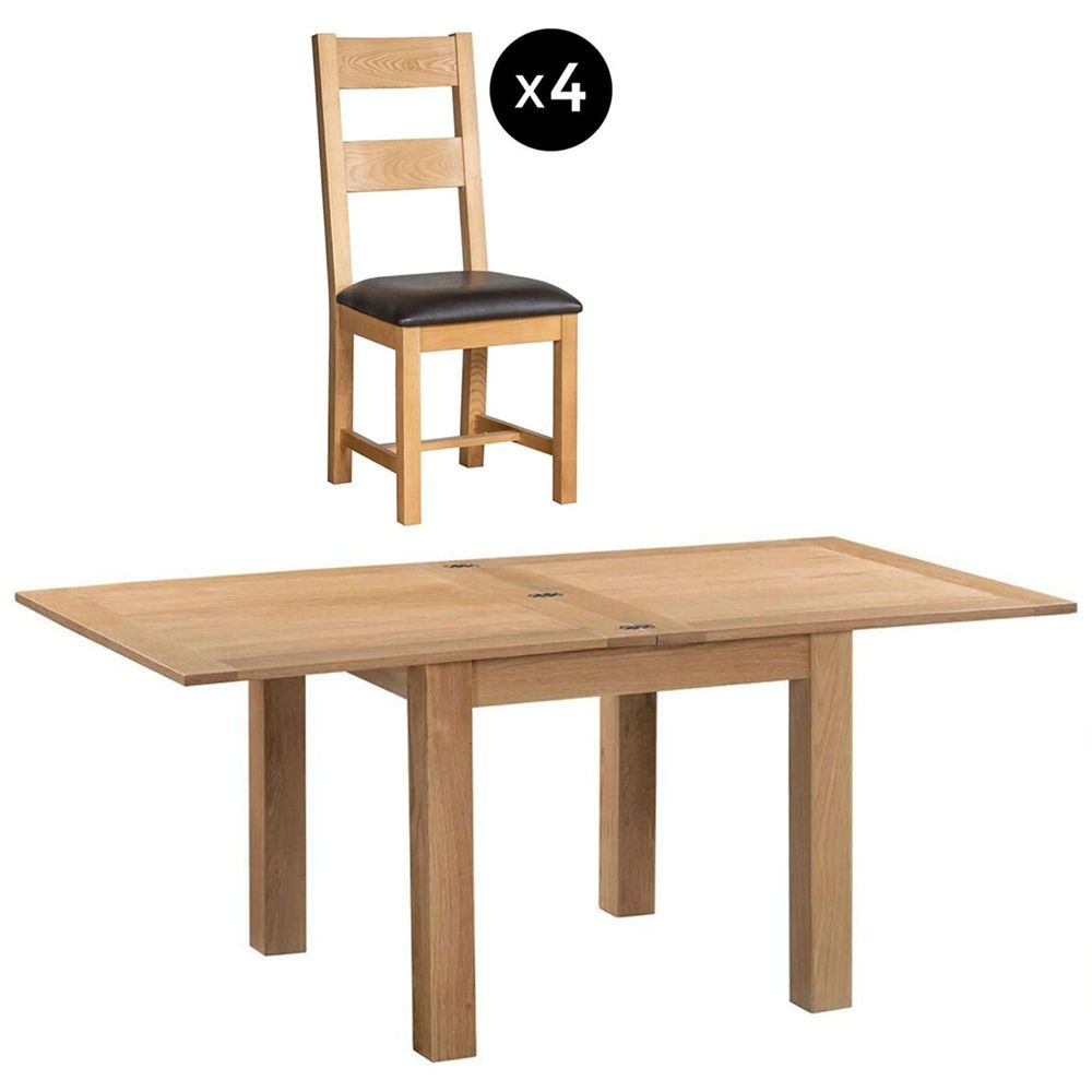 The set includes four sturdy ladder-back chairs, each fitted with a padded black faux leather seat for comfort and easy maintenance. Their timeless design pairs beautifully with the oak table, offering a harmonious blend of wooden craftsmanship and practical seating.